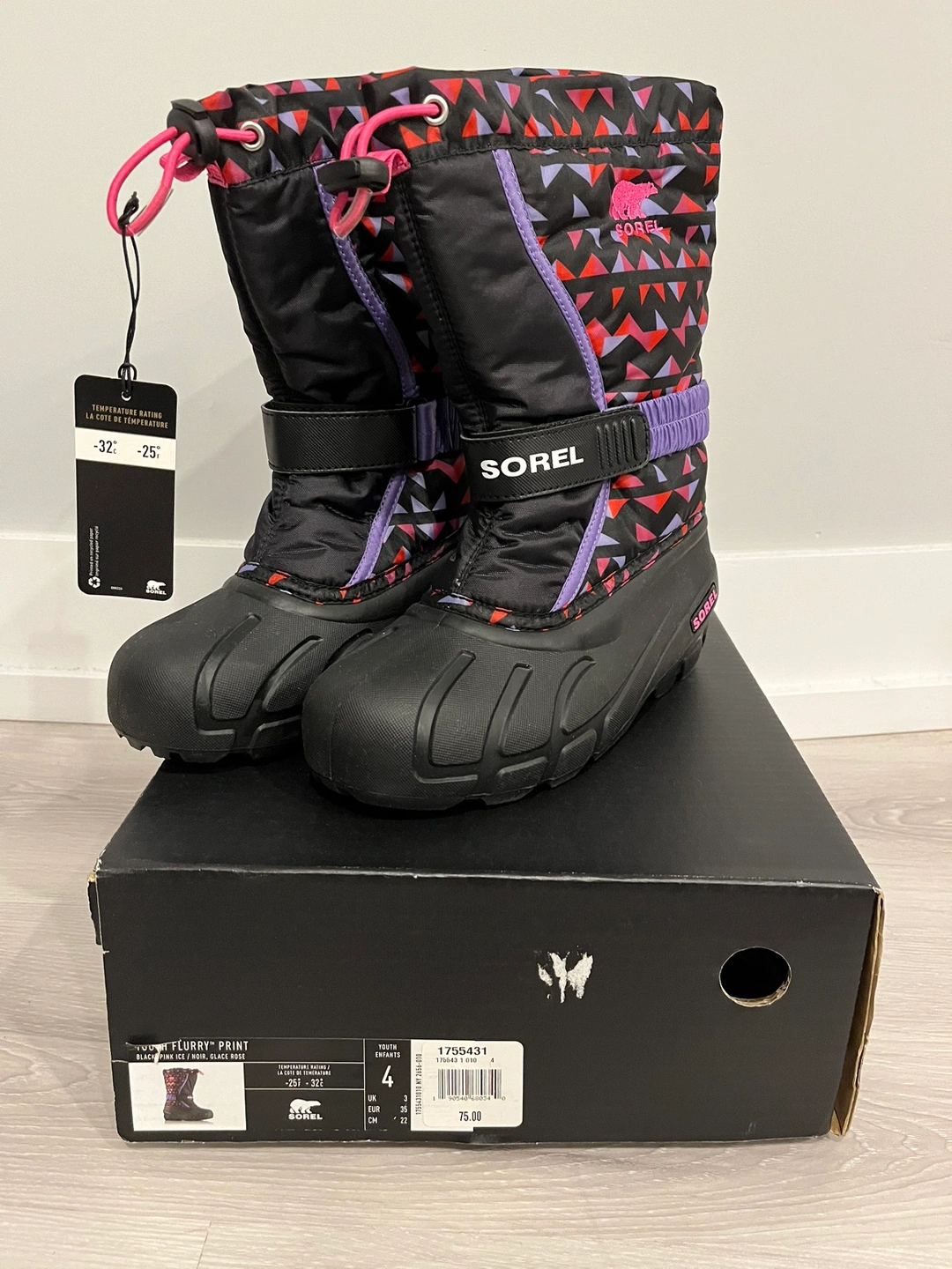 Smoke free pet free home Pick up only Yonge & Steeles Item brought to driveway Brand new Sorel winter boots Size 4 youth Good for -25 to -32 weather Easy to slip on with Velcro adjustment