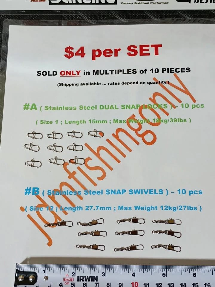 65Located in OSHAWA ... Ritson Road North and Taunton Road area *** $4 for a Set of 10 *** BRAND NEW , NEVER USED Stainless Steel Dual Snap Locks & Snap Swivels ... as pictured SET #A: Dual Snap Locks (multiples of 10 in a set) Size: 1 Length: 15 mm Max Weight: 18 kg / 39 lbs SET #B: Snap Swivels (multiples of 10 in a set) Size: 12 Length: 27.7 mm Max Weight: 12 kg *** SHIPPING AVAILABLE. Rates depend on Quantity. ***