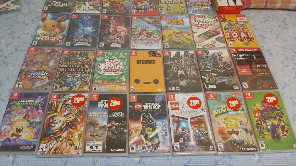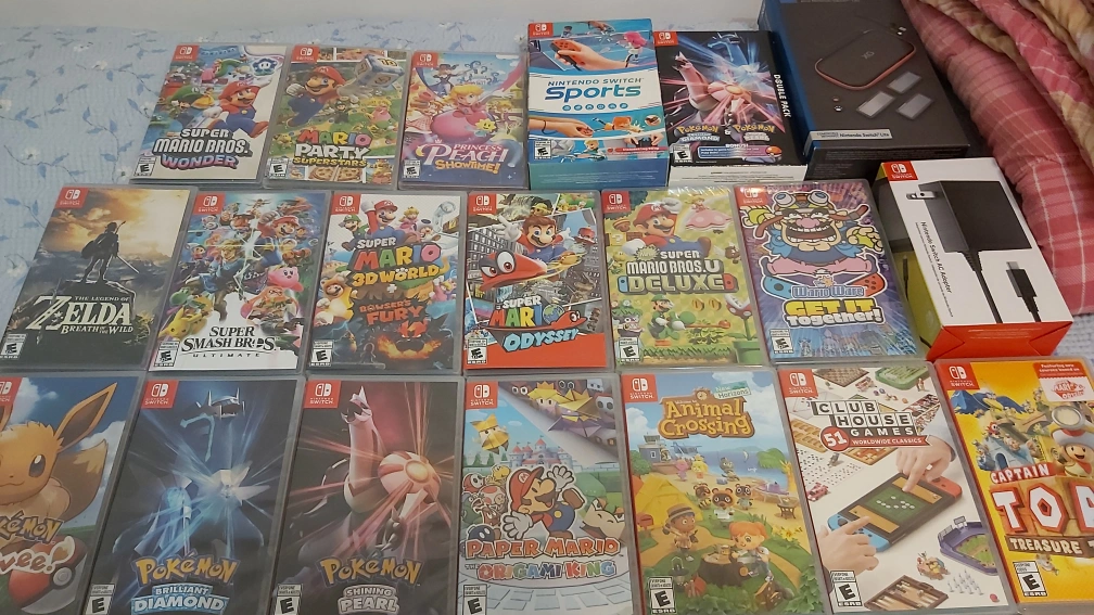 97All Switch Games are Brand New Sealed Condition unless stated otherwise Pokemon Brilliant Diamond Shining Pearl Double Pack $150 $70 each Super Smash Bros Ultimate Super Mario Bros Wonder Princess Peach Showtime $60 each Mario Party Superstars New Super Mario Deluxe Super Mario 3D Land Bowsers Fury Super Mario Oddyssey Paper Mario Origami King Wario Get it Together Pokemon Lets go Eeevee Pokemon Brilliant Diamond Pokemon Shining Pearl Nintendo Switch Sports Legend of Zelda Breath of the Wild $50 Each Enter the Gungeon Shovel Knight Capcom Fighting Collection The World Ends with you Korean box art Gundam Cross X Rays Open Box Super Mario Oddyssey Open Clubhouse Games 51 $40 each Nintendo Switch Power Adaptor Five Nights At Freddy Collection Captain Toad Open box Big Brain Academy $30 Each Brand New Zelda Switch Controller DragonBall fighter Z Nickelodeon All Star Brawl Lego Harry Potter Collection Lego Star Wars Skywalker Colledtion Star Wars Racer Republic Commando Lego DC Supervillians SpongeBob Rehydrated Buy any 3 get $10 off. Buy any 5 get $20 off Pickup Midland And ellesmere