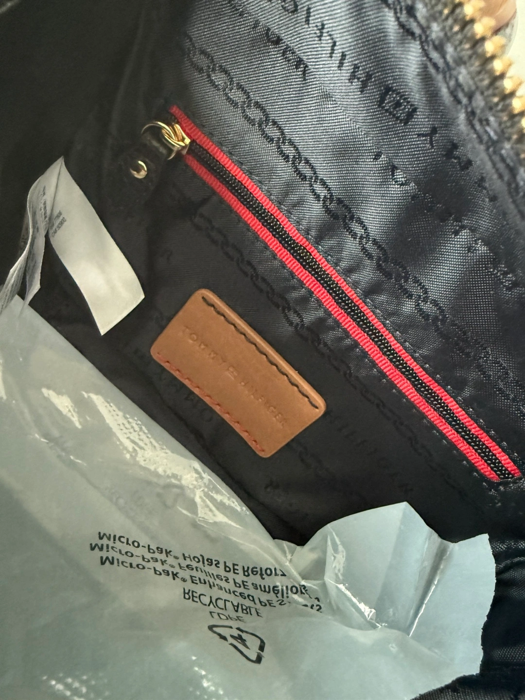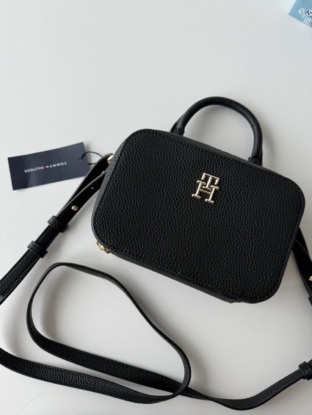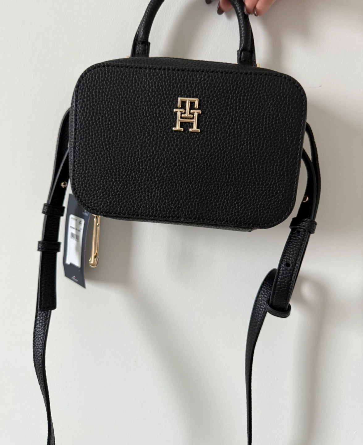 Small black handbag. Features a top handle and adjustable crossbody strap. Gold-tone hardware. Embossed Tommy Hilfiger logo. Interior zip pocket.