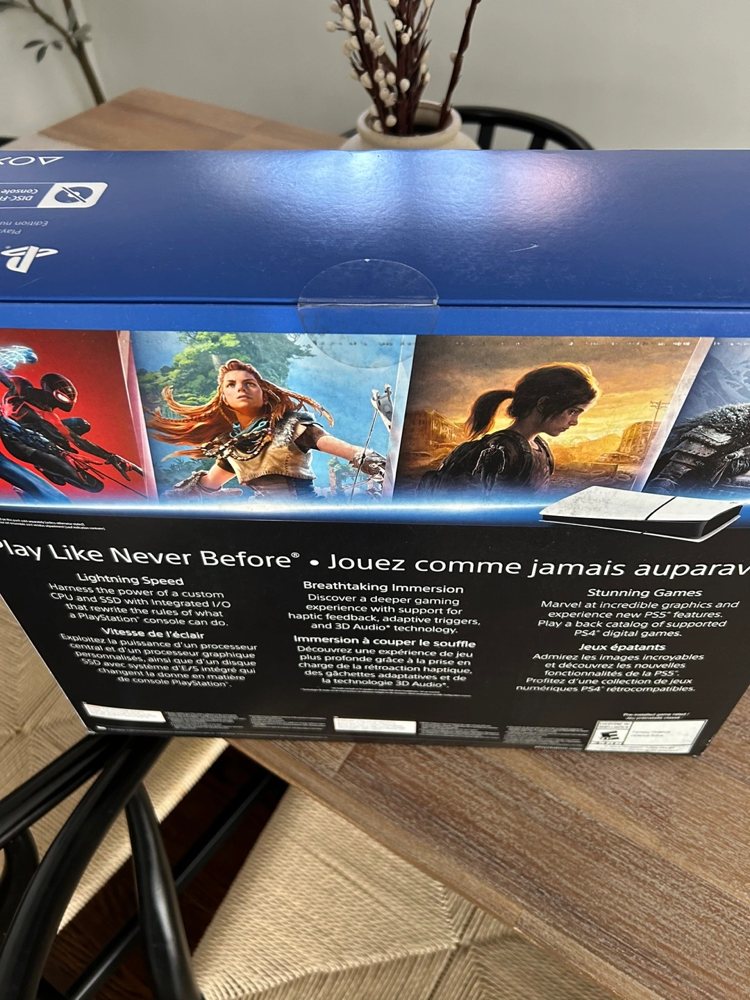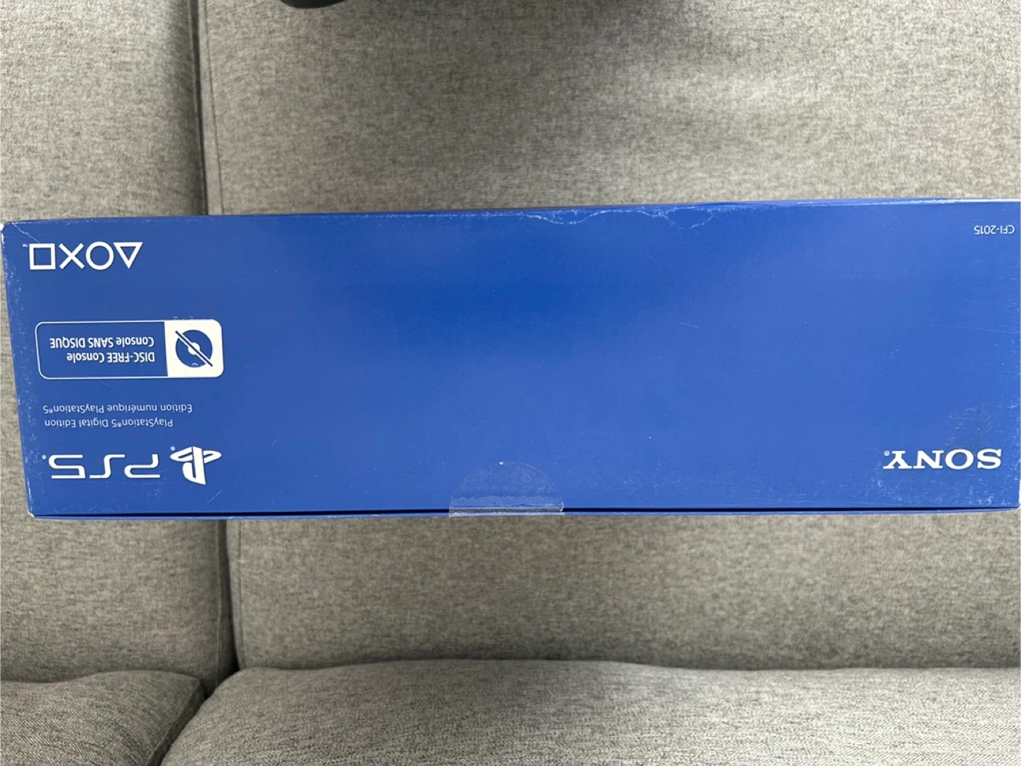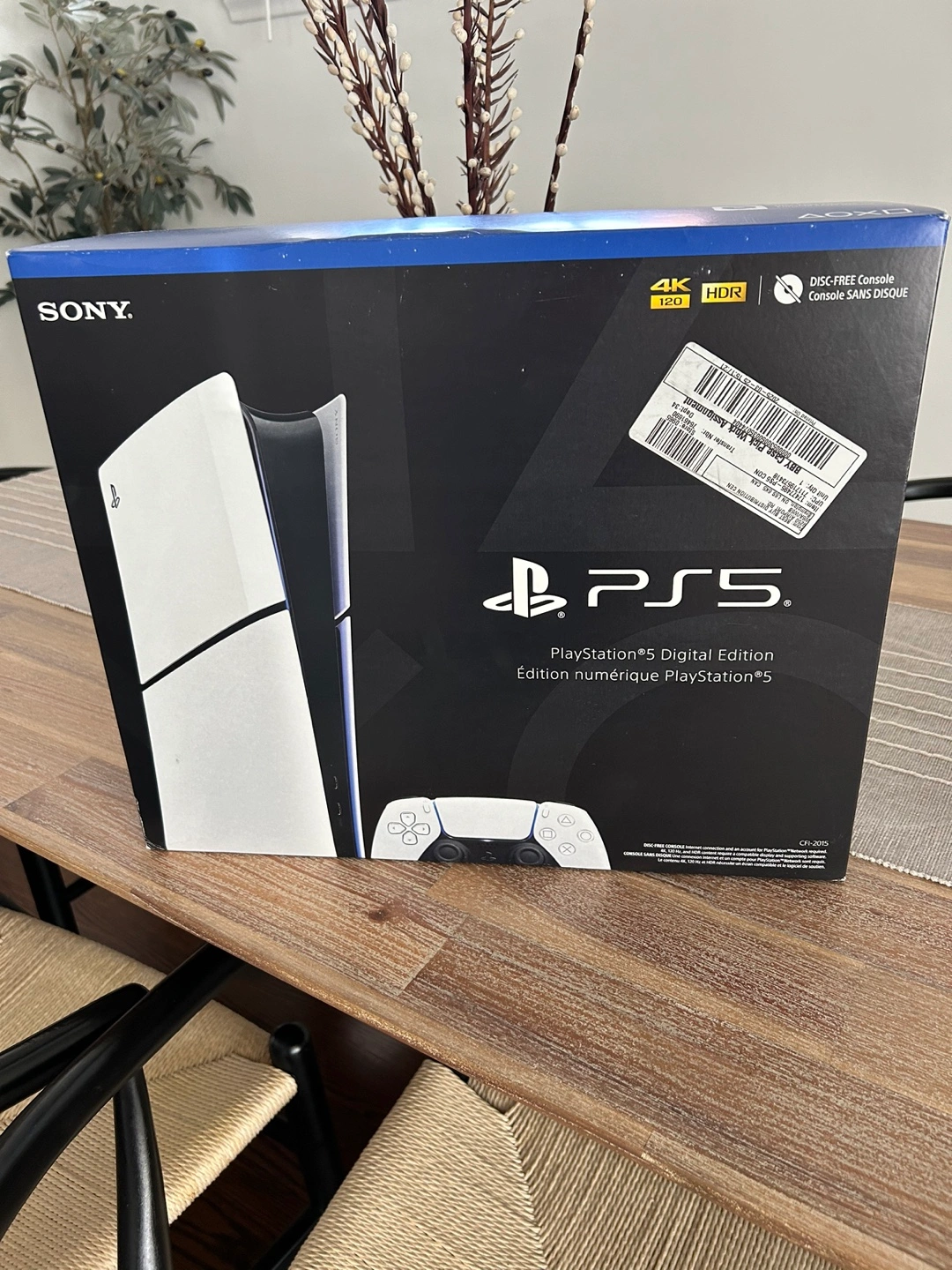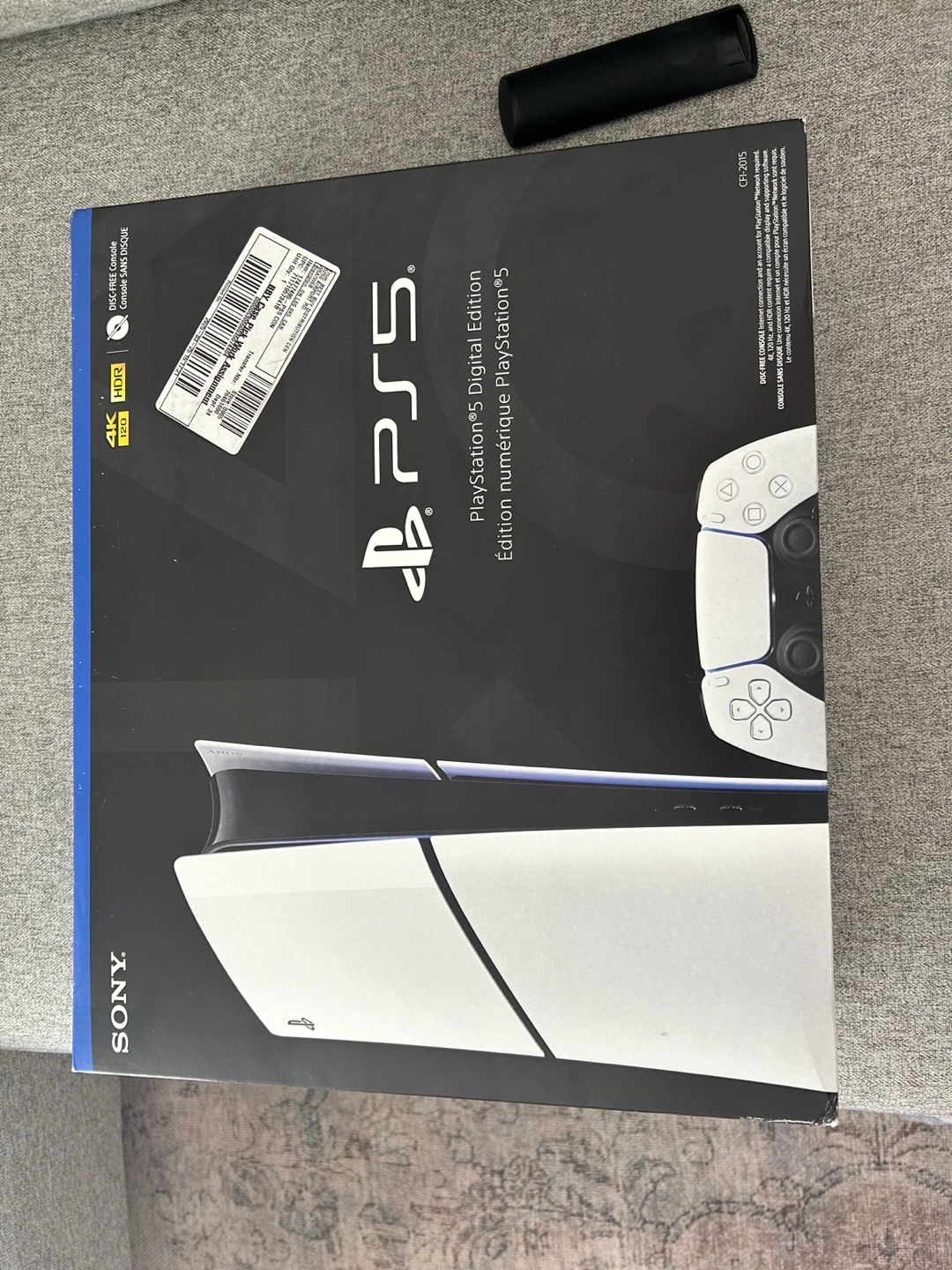 A PlayStation 5 Digital Edition console. Comes in its original packaging. Never been used.
