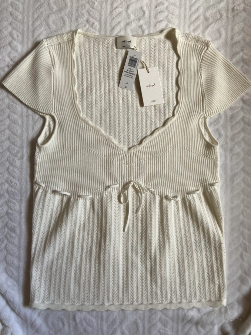 10Adds a touch of elegance to your wardrobe with this beautiful Wilfred top from Aritzia. This delicate knit blouse is perfect for dressing up or down, making it a versatile piece for any occasion. **Features:** - **Color:** Soft, off-white/ivory that complements any skin tone and pairs well with various outfits. - **Design:** Scalloped edges and intricate knit pattern give this top a feminine and chic look. The adjustable drawstring waist adds a flattering silhouette. - **Material:** High-quality, soft knit fabric that feels luxurious against the skin. - **Size:** L/G (Large) - **Condition:** Brand new with tags attached, never worn. This top is ideal for layering or wearing on its own for a sophisticated look. **Price:** $50. Feel free to contact me for more details or to arrange a purchase.