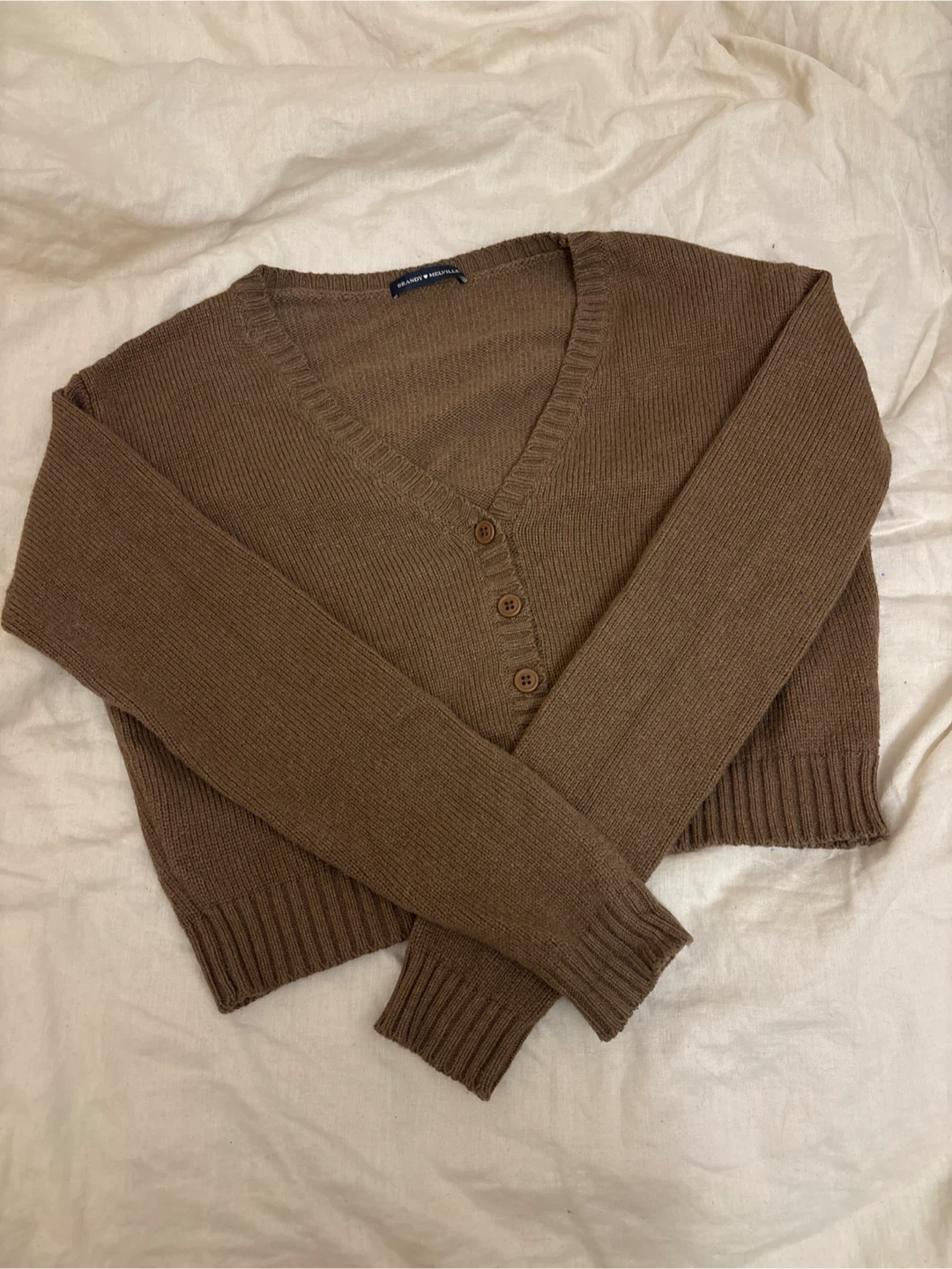 15Selling a Brandy Melville cardigan Mocha 🤎 Knitted V-neck style with button closure The material composition is: - 45% Viscose - 25% Wool - 25% Polyamide/Nylon - 5% Cashmere