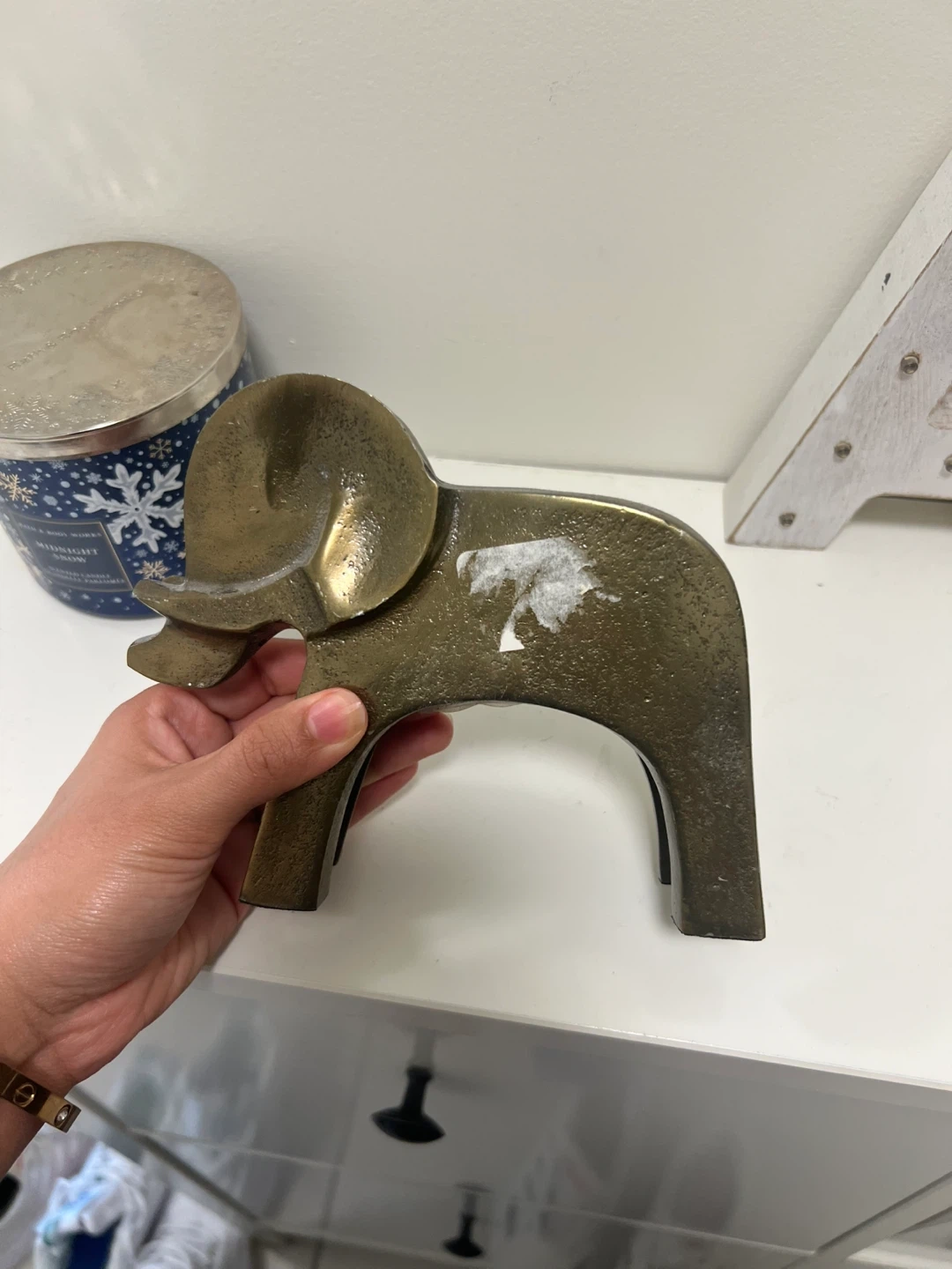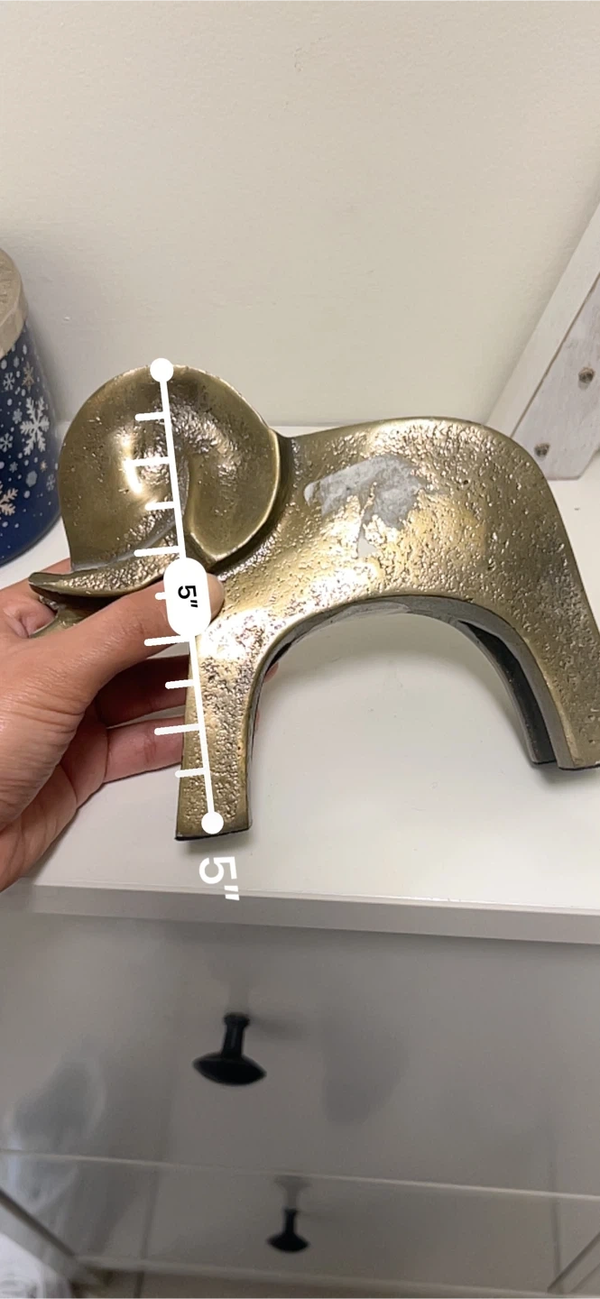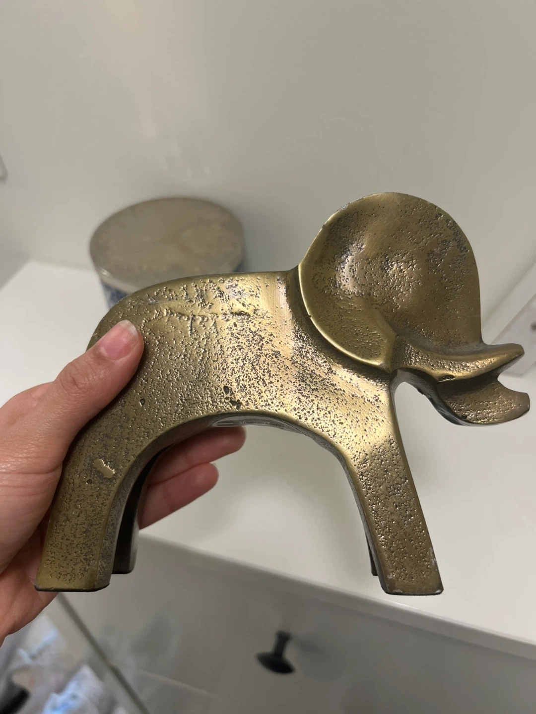 Selling a cute brass elephant figurine! It's about 5 inches tall and would look great as a decorative piece in your home. It does have some signs of wear, as shown in the pictures, but still has a lot of charm
