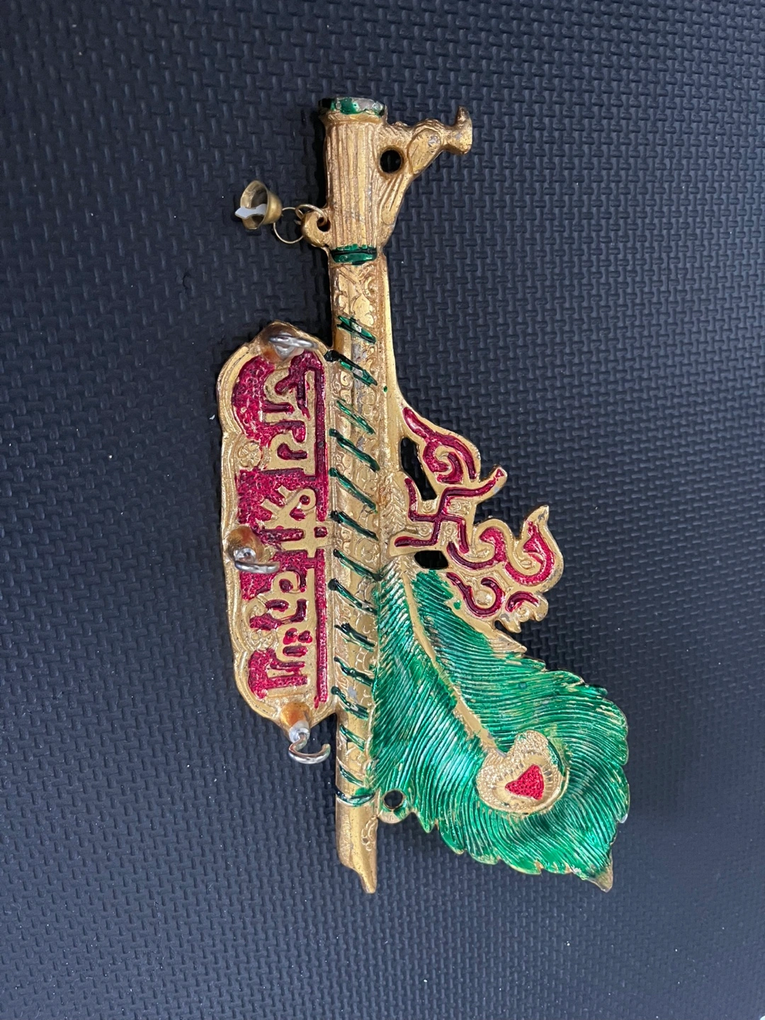 Antique key holder. Features a peacock feather and flute design. Gold and green colours. Three hooks for keys. Small bells.