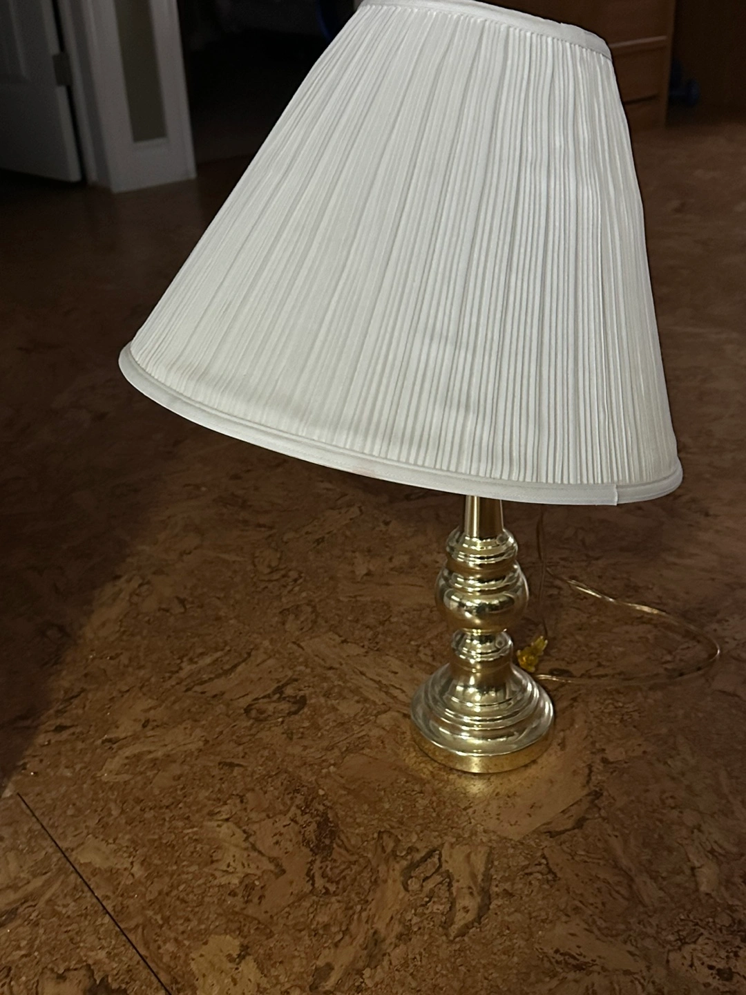 Brass table lamp with white pleated lampshade. The lamp is in good condition and comes with a cord and plug.