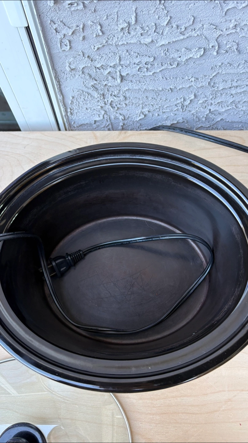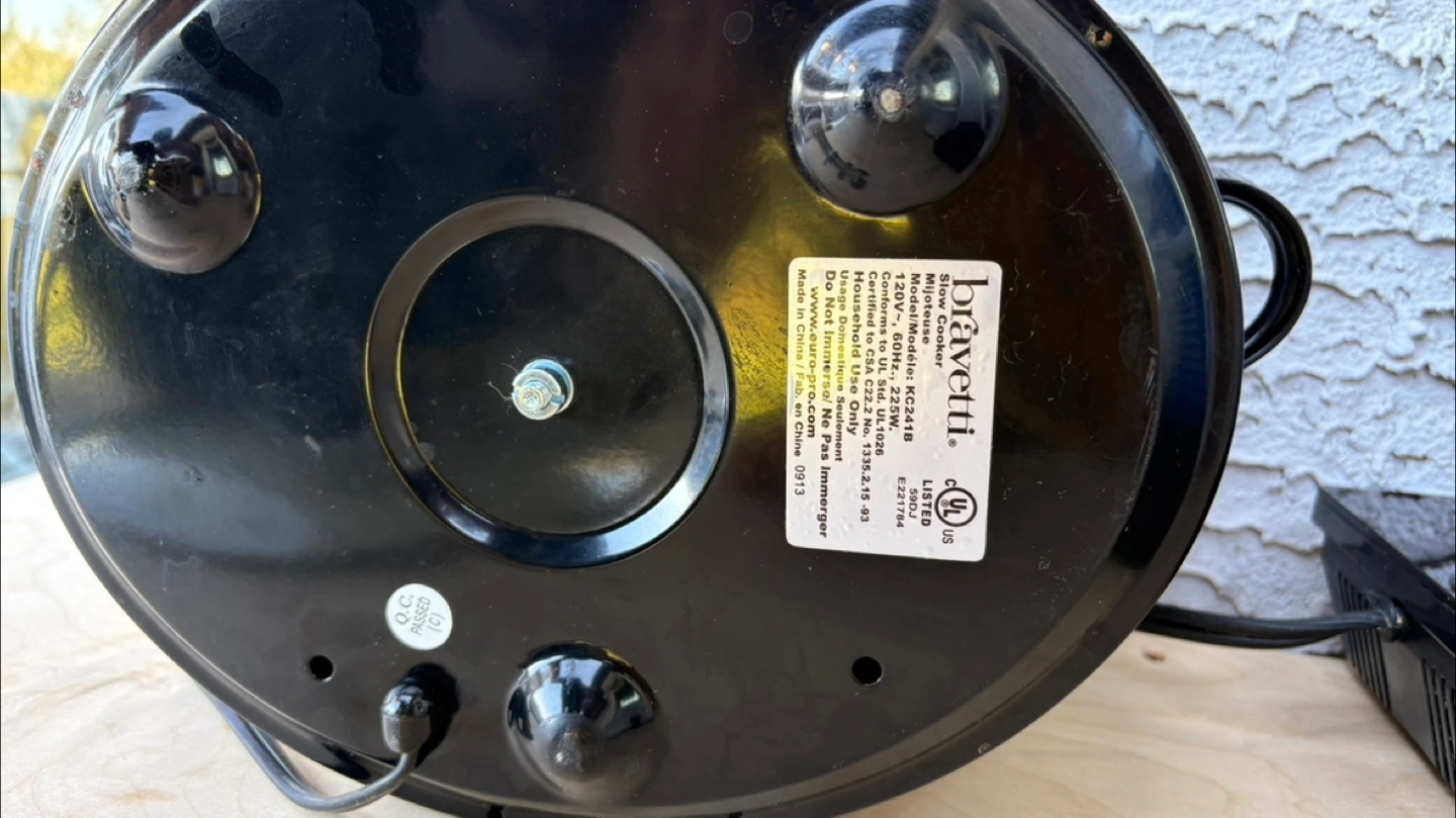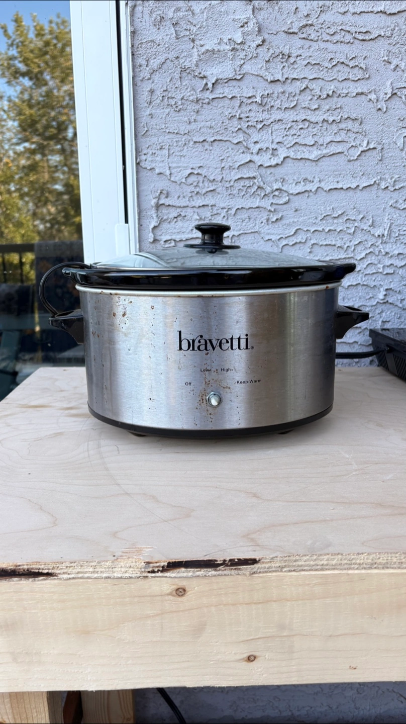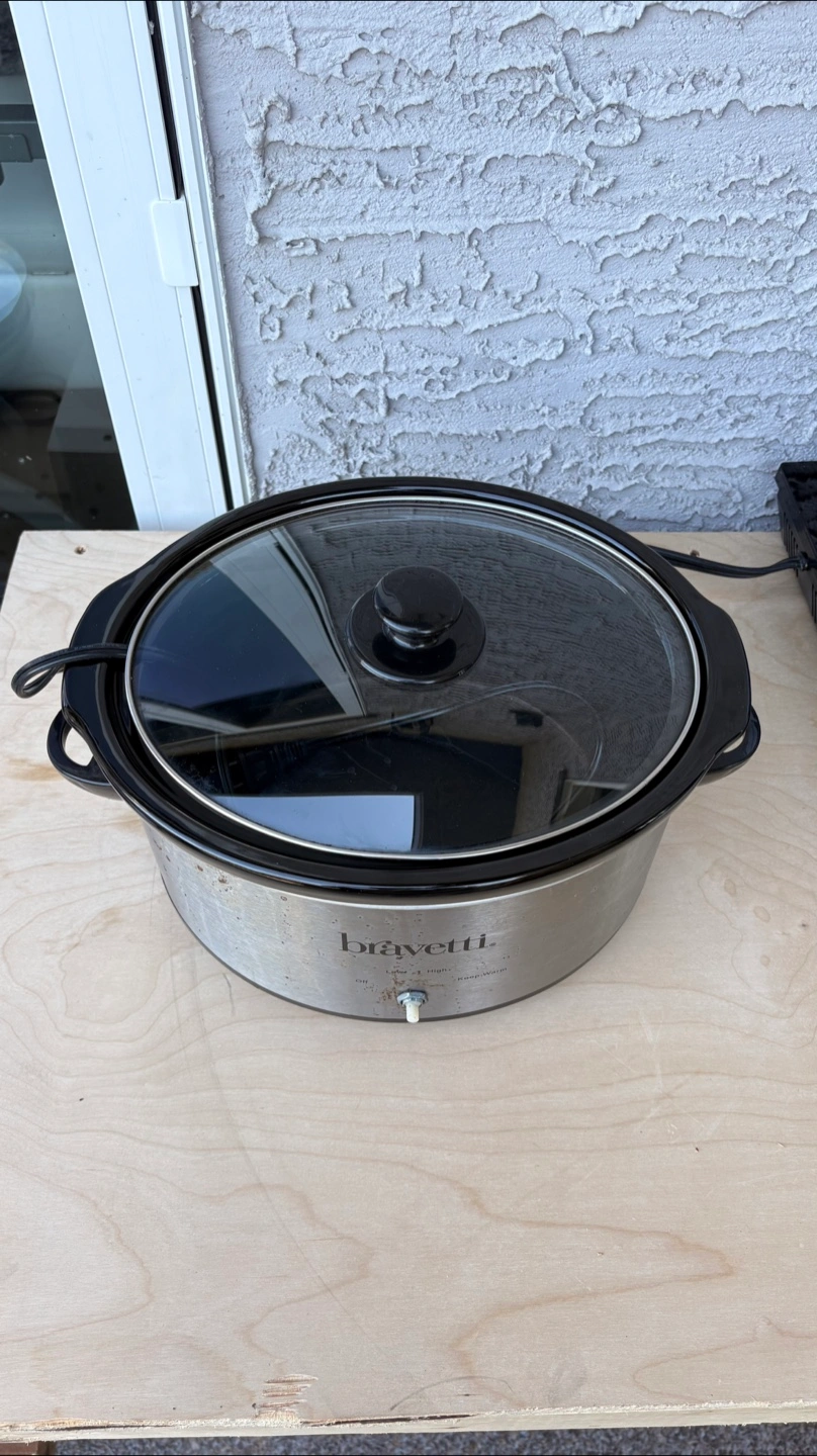 This is a Bravetti slow cooker, a kitchen appliance used for cooking food slowly at a low temperature. It has settings for Low, High, and Keep Warm, and includes a removable crock and a glass lid. Condition is good, except the rotating switch from the front is missing but it still works perfectly fine without it.