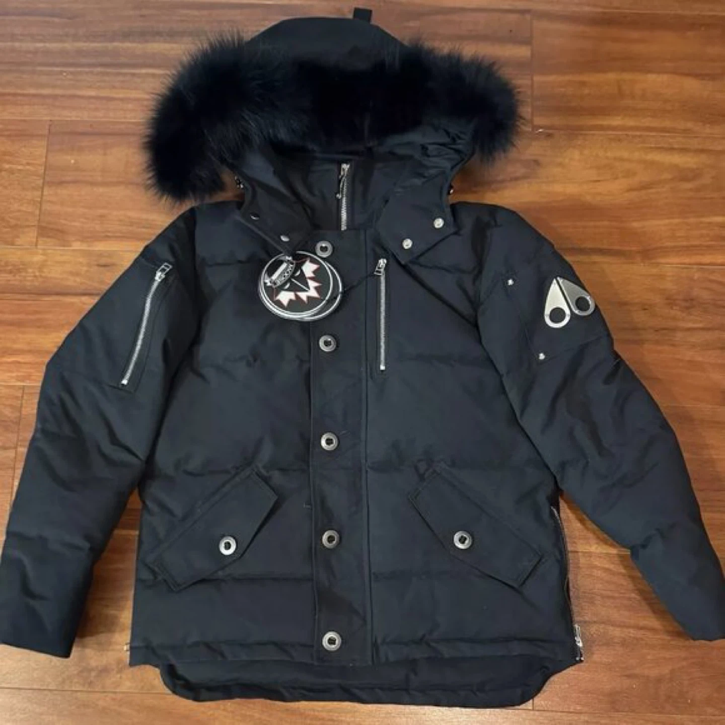 Selling a Moose Knuckles down-filled bomber jacket! It's in brand new condition and ready for the cold weather. The jacket features a fur-trimmed hood and the iconic Moose Knuckles logo on the sleeve. It's a stylish and warm choice for winter