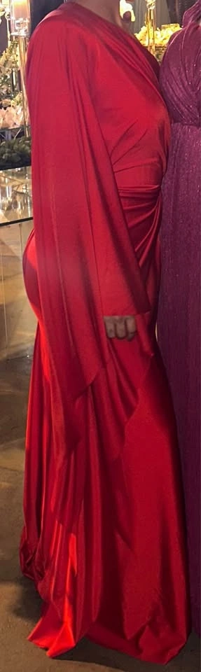 65Selling this stunning long red gown, worn only once as a bridesmaid at my cousin’s wedding. Made in Brazil, this dress features a one-shoulder neckline with delicate shine detailing and a fluid overlay that adds movement and elegance. It’s the perfect dress for weddings, gala parties, or any special evening event. You’ll feel classy, confident, and unique!