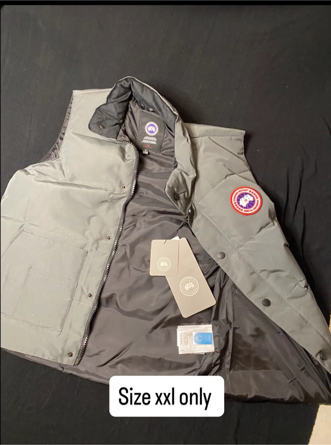 Canada Goose puffer vest in grey and black. Available in size. This vest has a zippered front and pockets. It's a great layering piece for cooler weather.