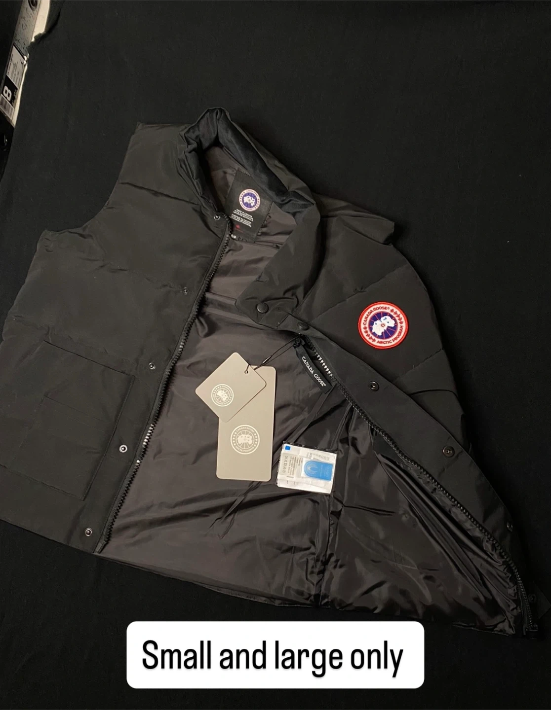 Canada Goose puffer vest in grey and black. Available in size. This vest has a zippered front and pockets. It's a great layering piece for cooler weather.