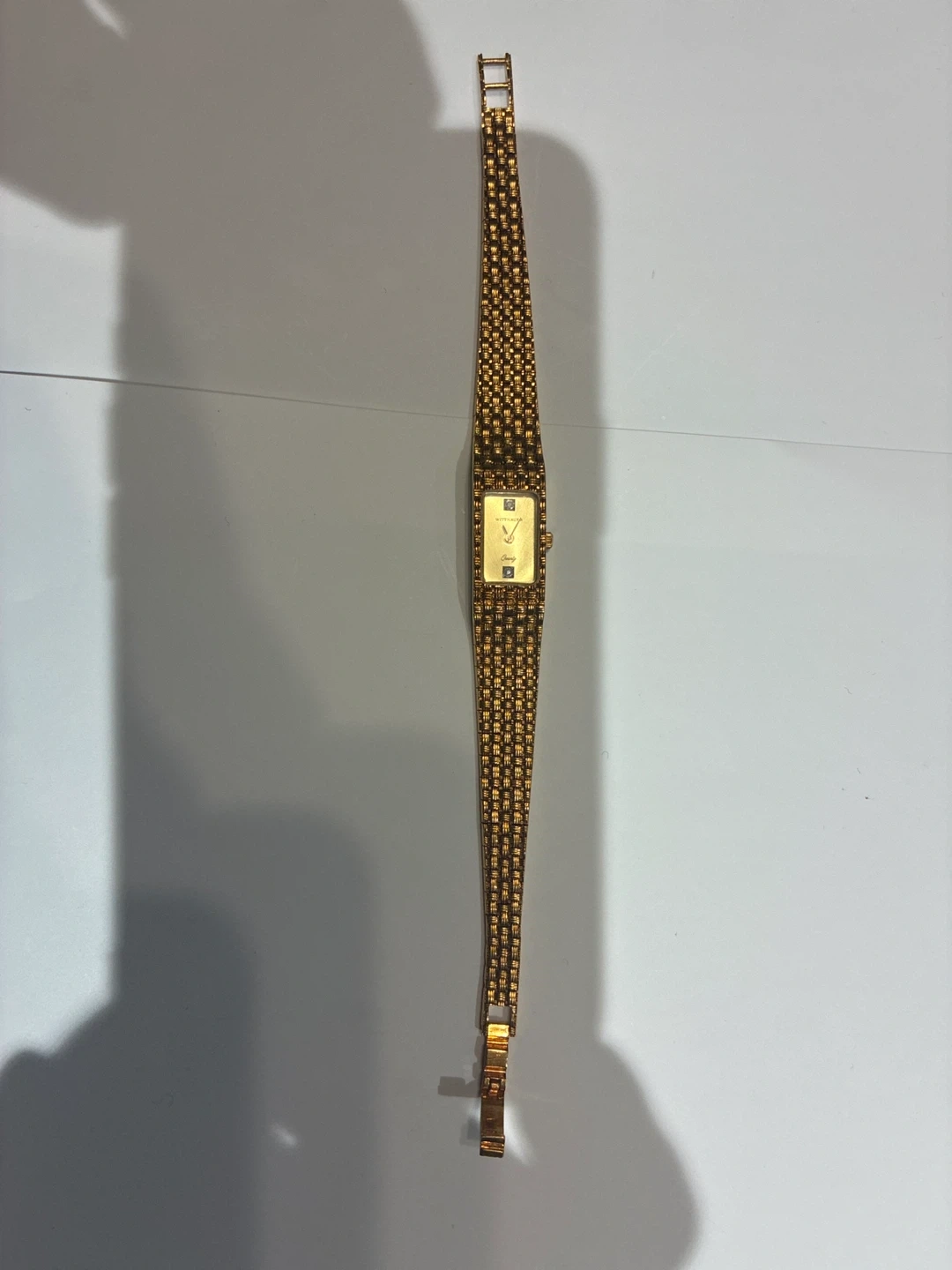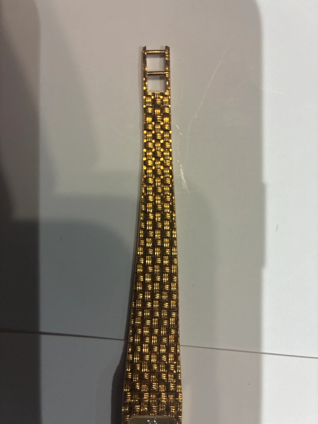 Vintage.This is a Wittnauer quartz watch with a gold tone finish. It features a rectangular face and a woven band. The watch is in good condition.