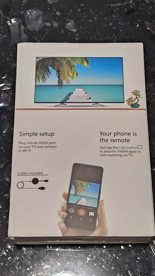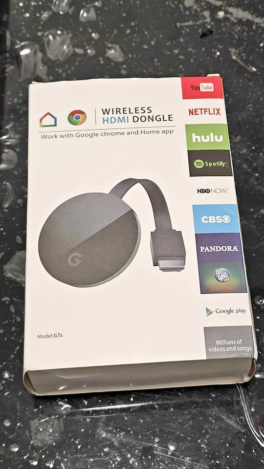 New in box. This handy wireless HDMI dongle lets you stream video and audio to your TV. Works with Google Chrome and Home app. Has simple setup, just plug into your TV's HDMI port and connect to Wi-Fi. Your phone is the remote for popular apps like YouTube, Netflix, Hulu, Spotify, HBO NOW, CBSO, and Pandora. Cables included.