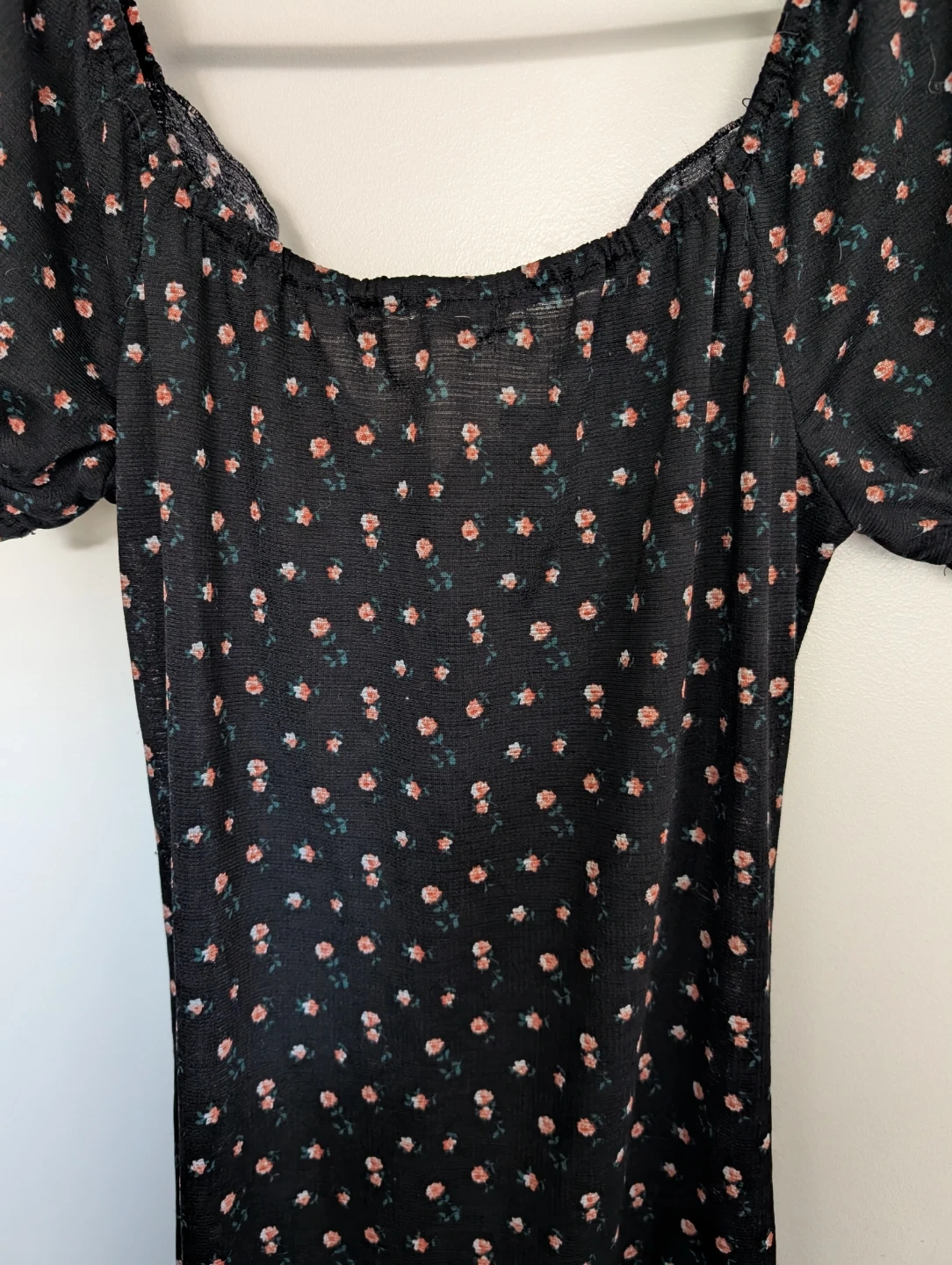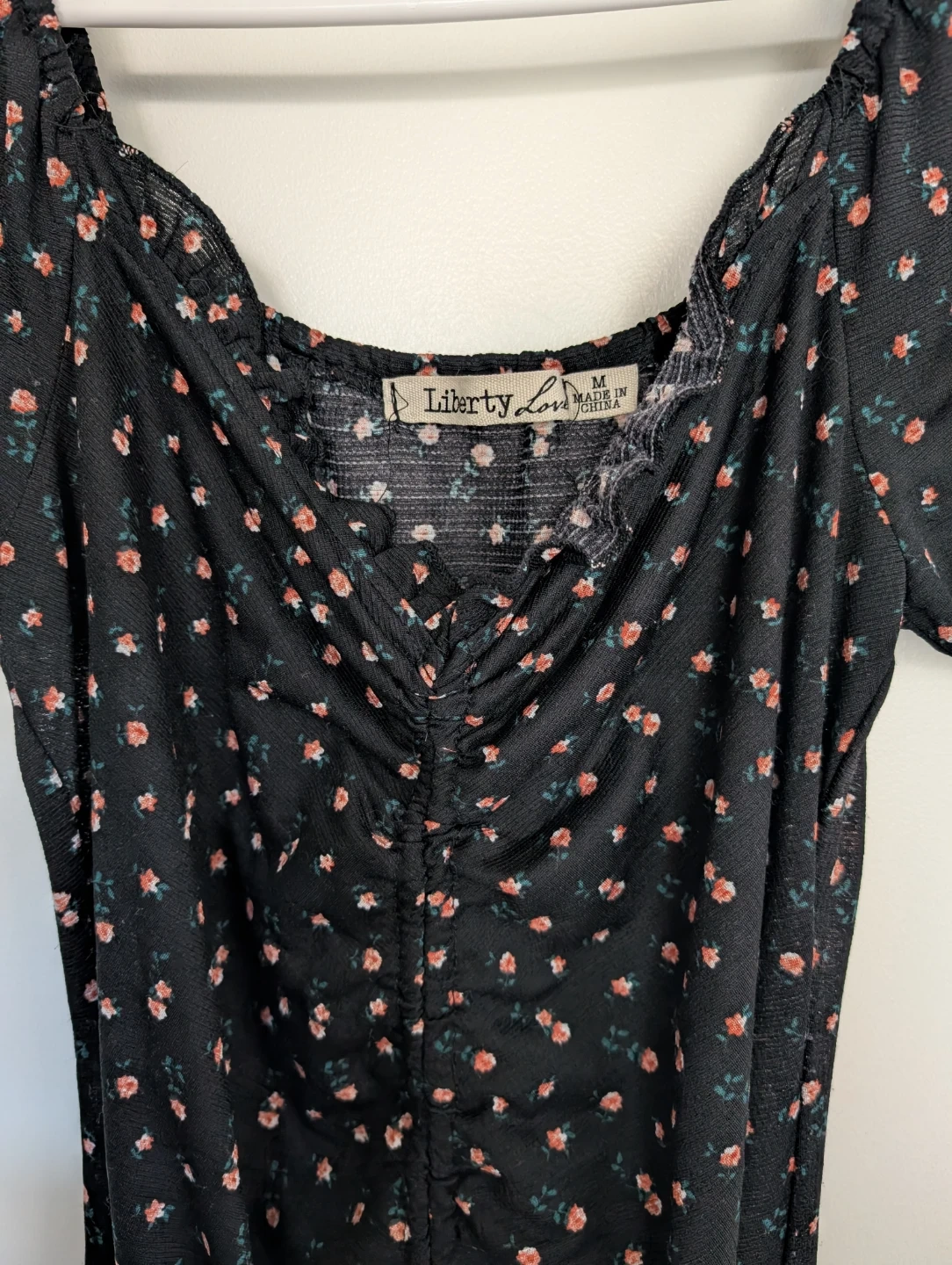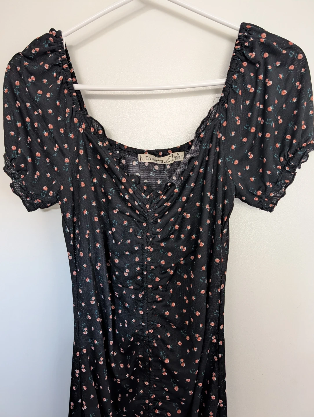 This Liberty Love midi dress features a black base with a delicate floral print. It has short puff sleeves and a ruched front detail with a tie at the hem. The square neckline gives it a flattering silhouette. Size medium.