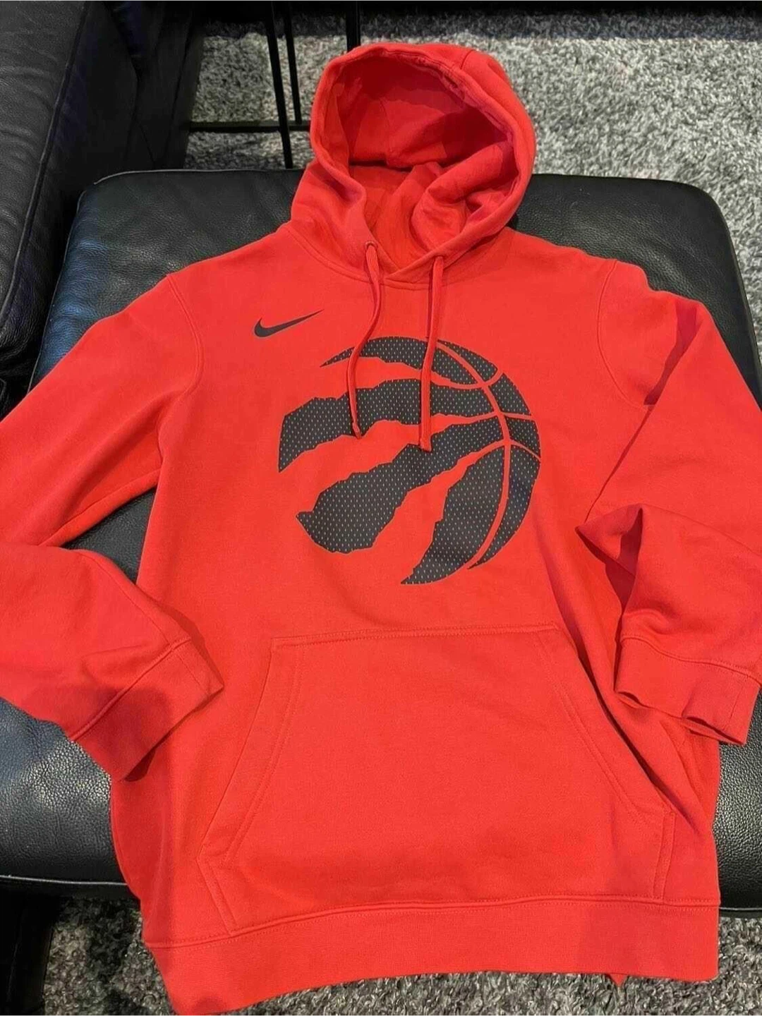 This is a red Nike hoodie with the Toronto Raptors logo. It's a size small and made in Vietnam. It features a front kangaroo pocket.