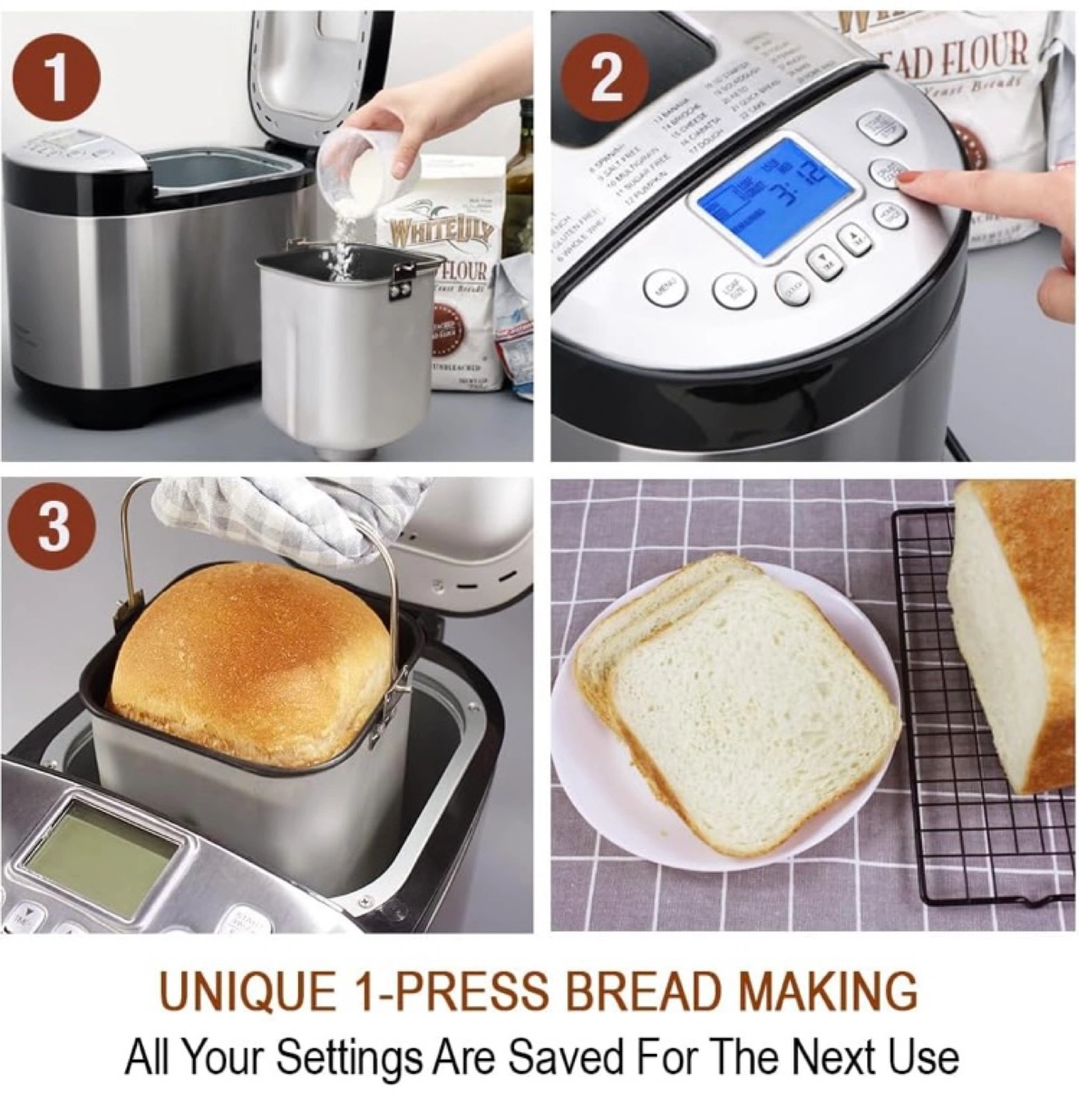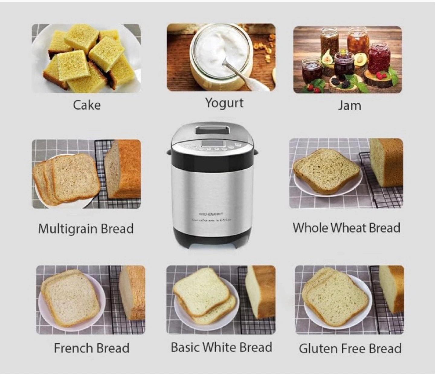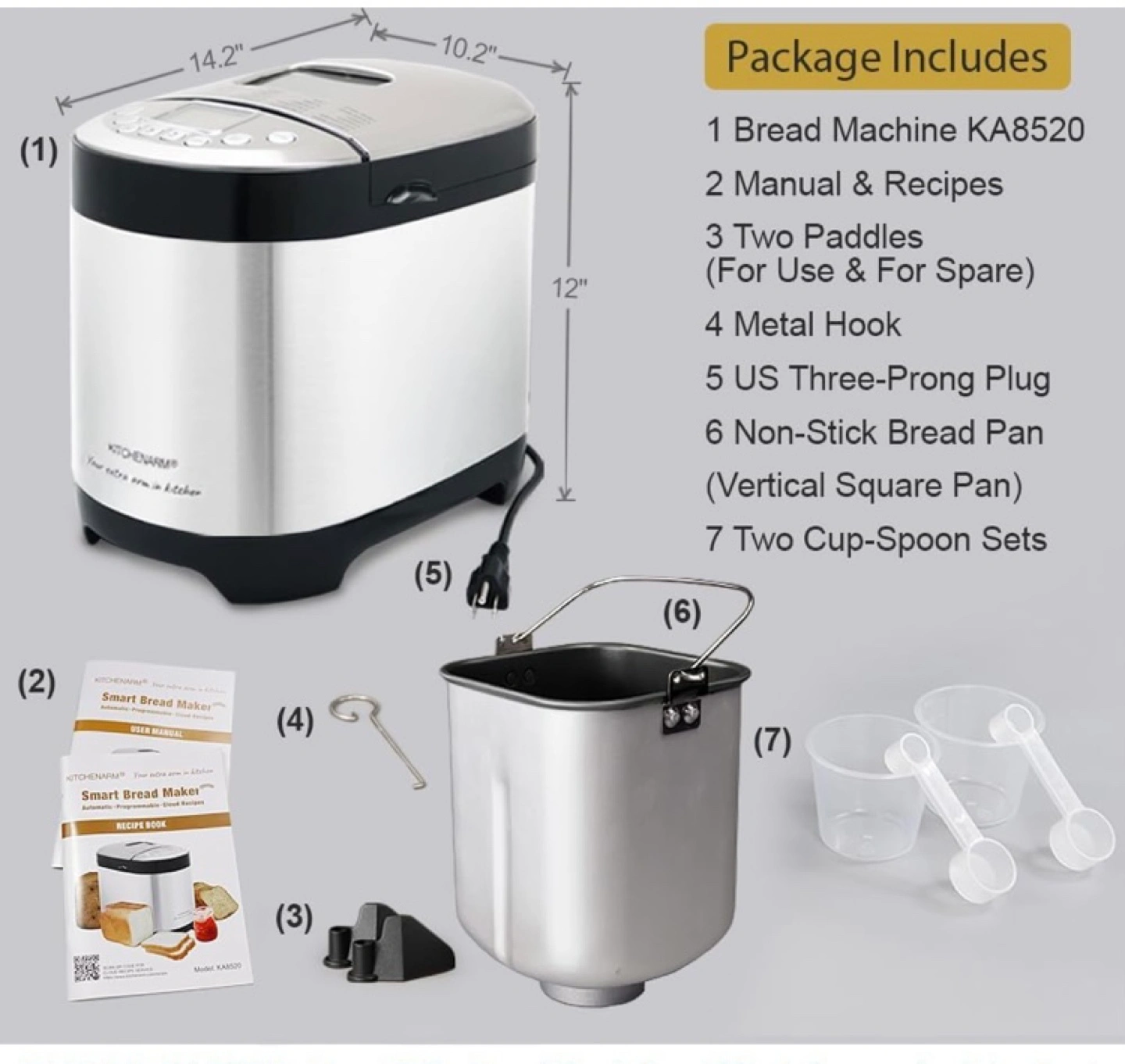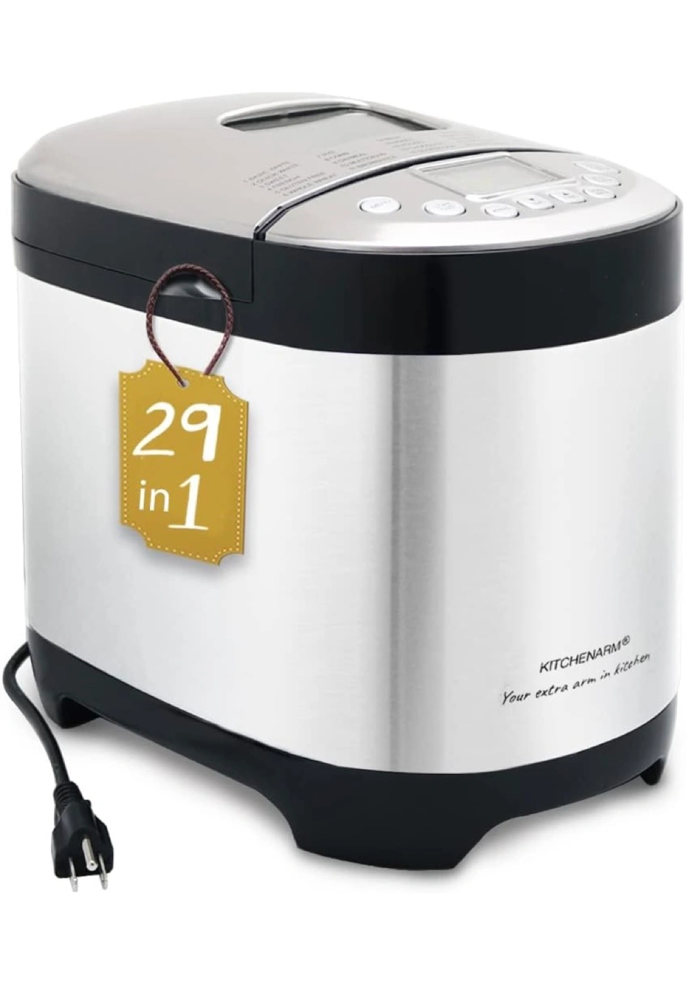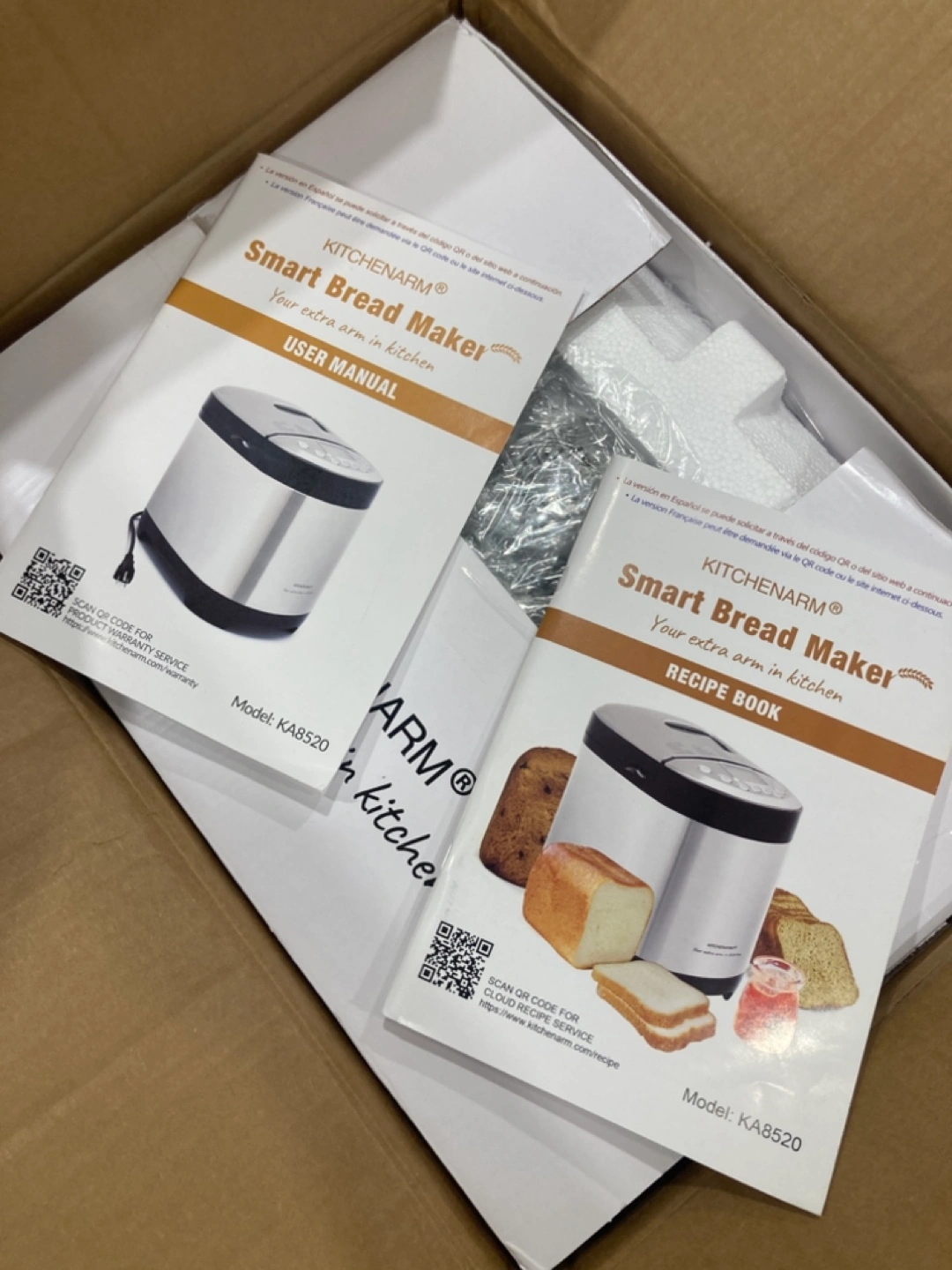 New Kitchenarm Smart Bread Maker. Model KA8520. 29-in-1 functions. Includes two paddles, metal hook, non-stick bread pan, measuring cups and spoons. User manual and recipe book included.