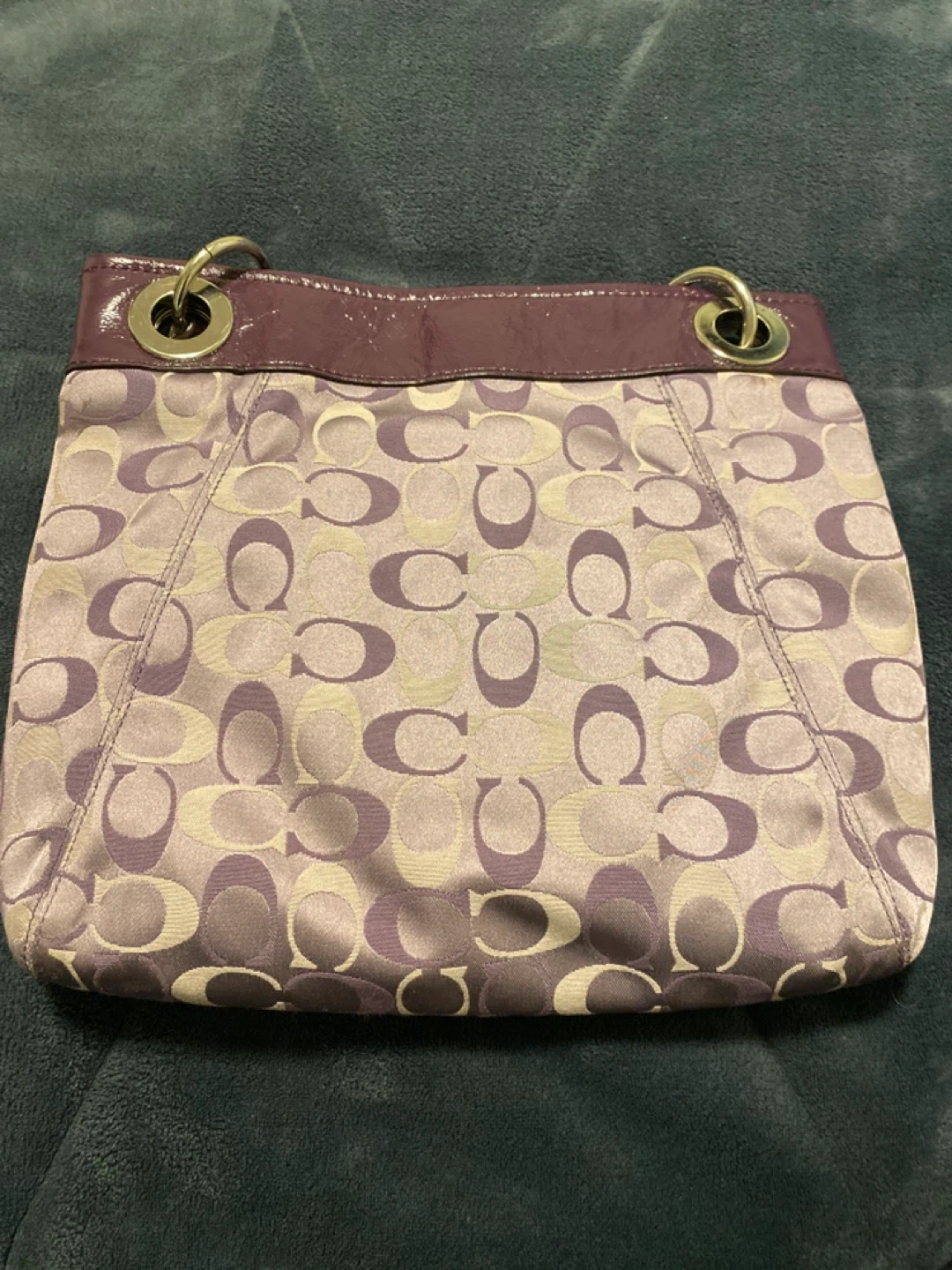 Stylish Coach shoulder bag with a signature jacquard pattern. Features a purple patent leather trim and interior lining. Includes an interior zippered pocket for essentials.