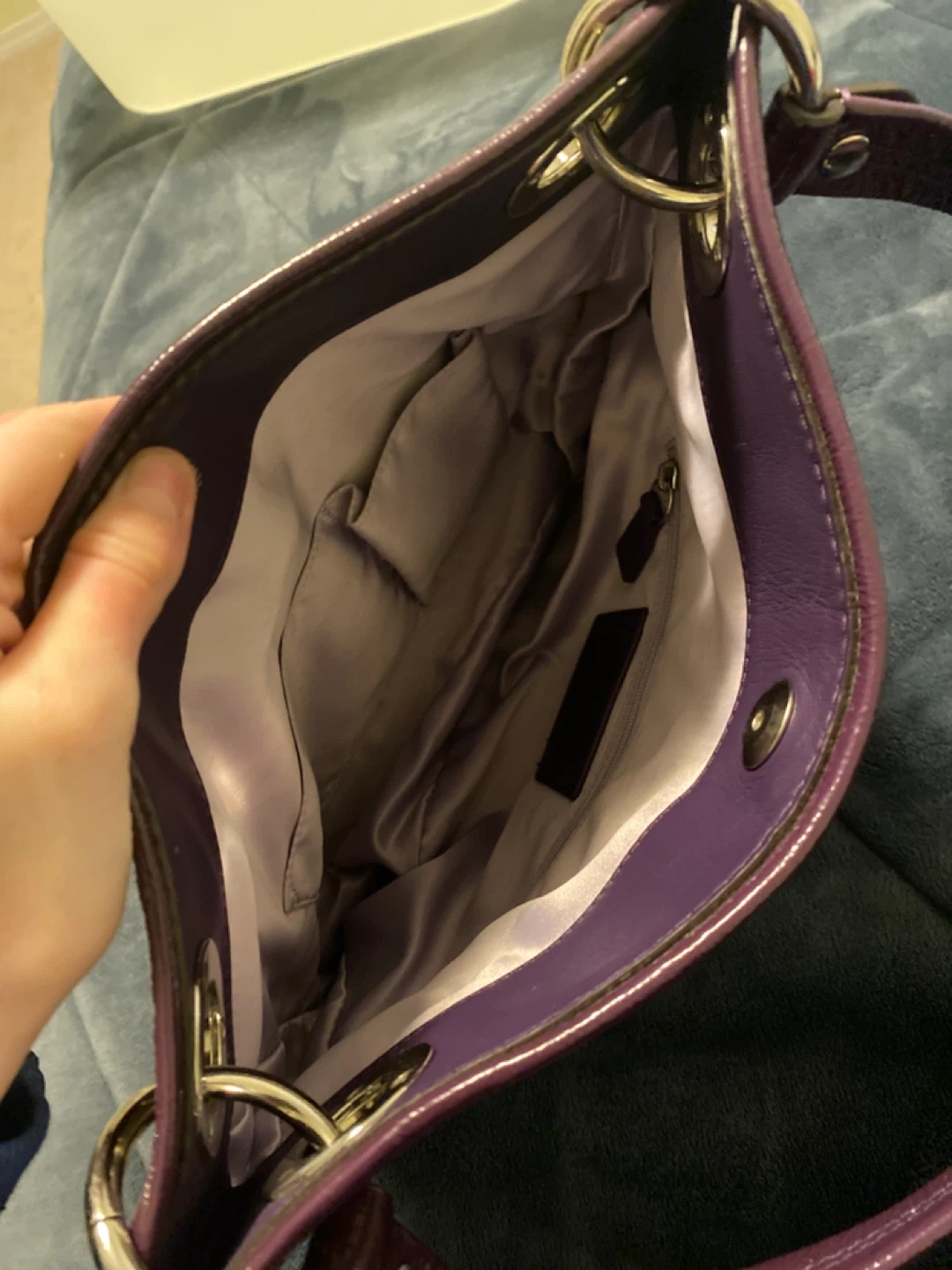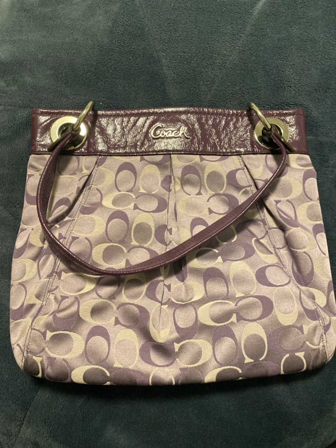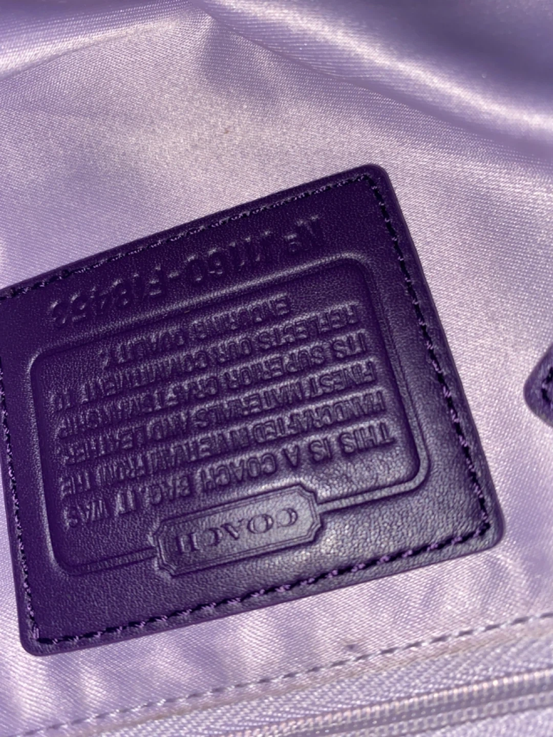 Stylish Coach shoulder bag with a signature jacquard pattern. Features a purple patent leather trim and interior lining. Includes an interior zippered pocket for essentials.