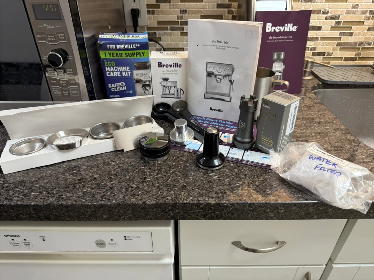 For the coffee enthusiast! Includes: Breville the Infuser BES840XL espresso machine. Breville the Smart Grinder Pro BCG820BSSXL It comes with all the accessories shown in the photos, including the instruction books and quick reference guide. Includes: machine care kit, descaler,tamper, funnel, coffee distributor, water filter.