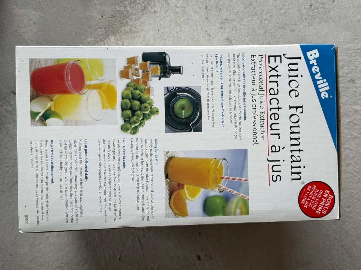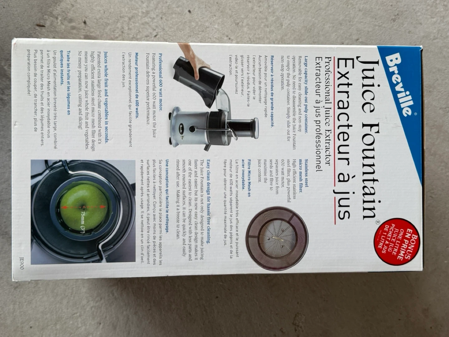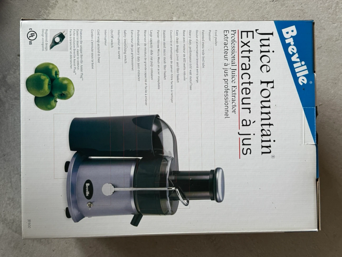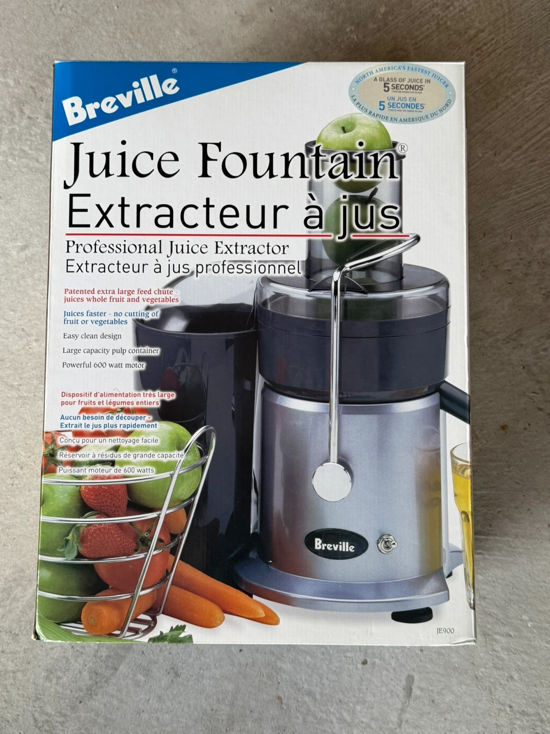 18Breville Juice Fountain, model JE900. Juice extractor that can handle whole fruits and vegetables. 600-watt motor