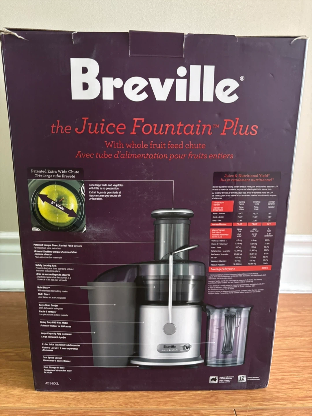 Selling a Breville Juice Fountain Plus! This juicer has a patented extra-wide chute, so you can juice large fruits and vegetables with little to no preparation. It also features a patented unique direct central feed system for maximum juice extraction. The safety locking arm prevents the juicer from operating without the cover locked in place. Easy clean design with dishwasher-safe parts too! Comes in a box with all parts intact.