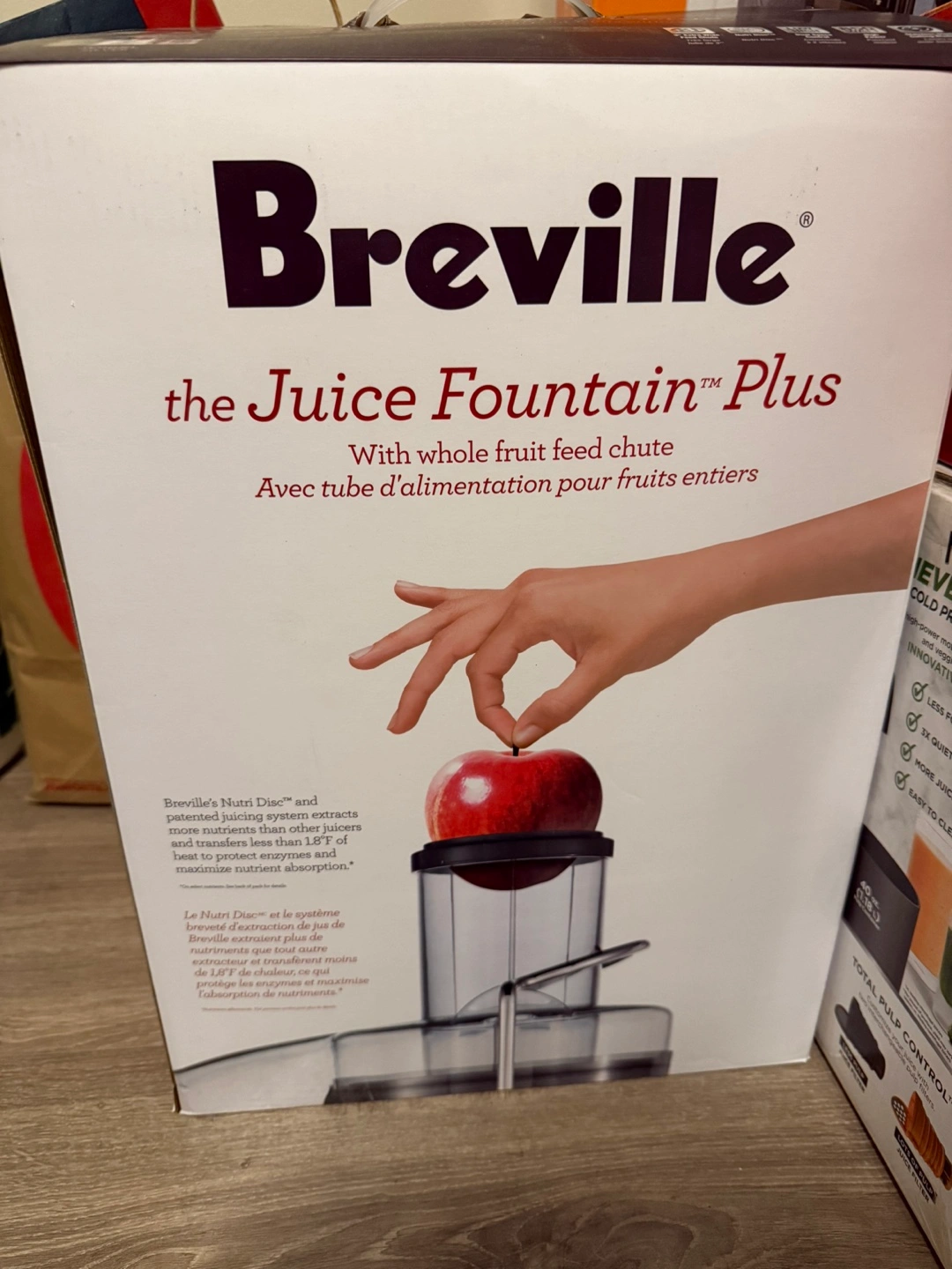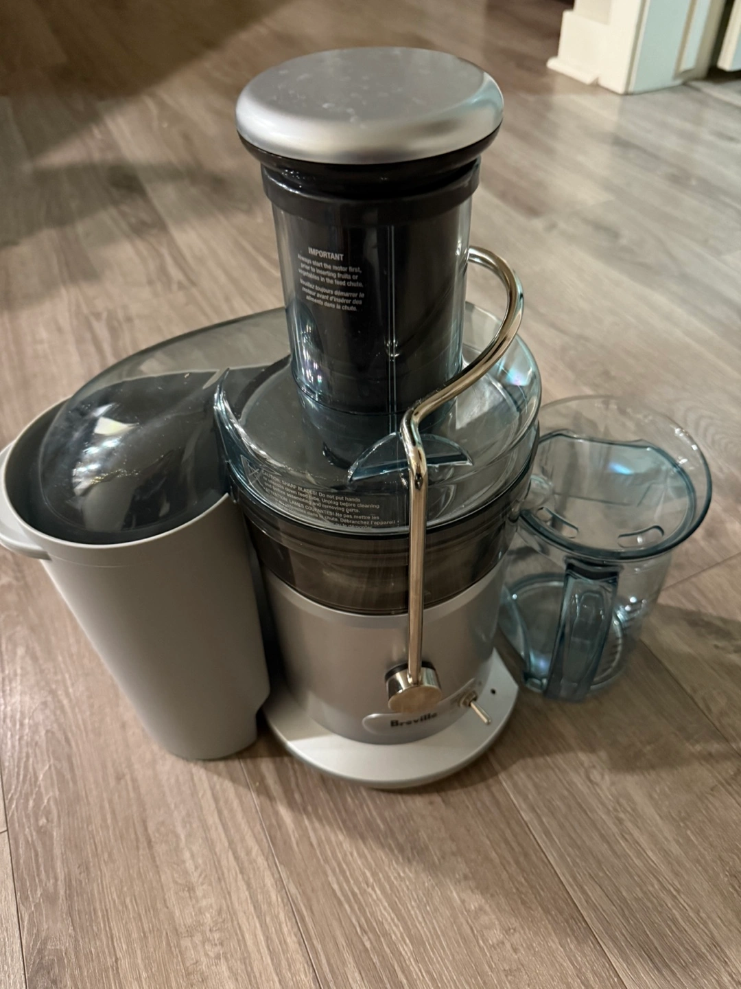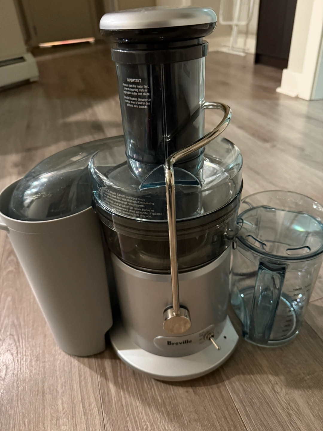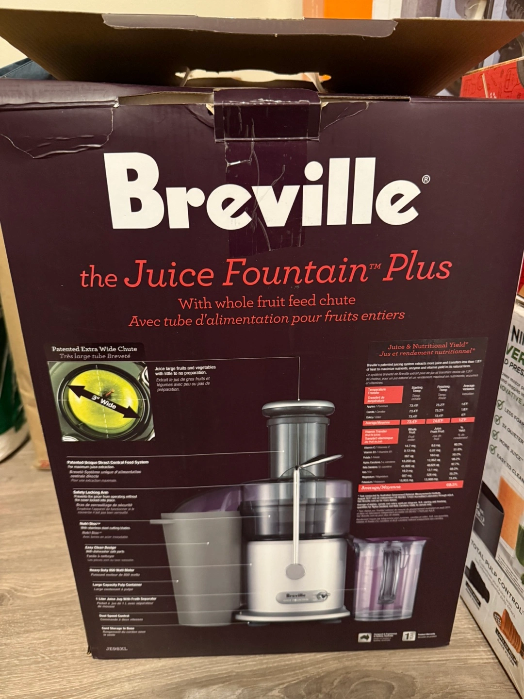 Breville Juice Fountain Plus juicer, includes all parts. Comes with pulp container, juice container, and cleaning brush. In excellent condition, no cracks or damage, hardly used 3-4 times, warranty still remaining till June’25. Comes with original box. Pickup in downtown SW.