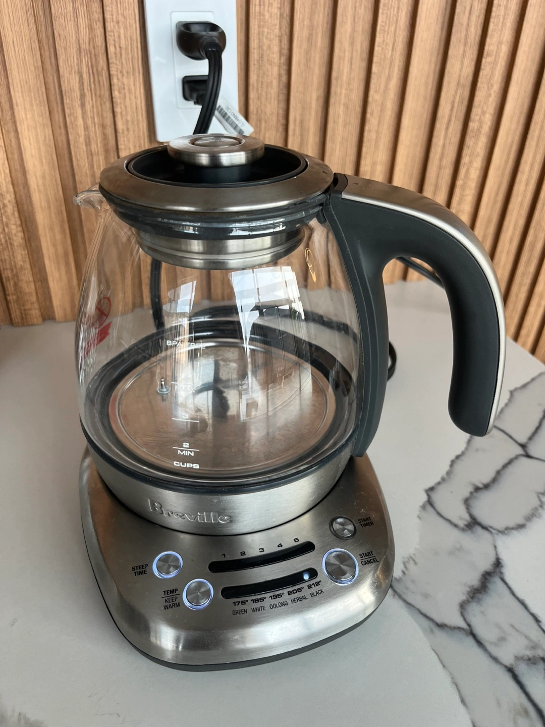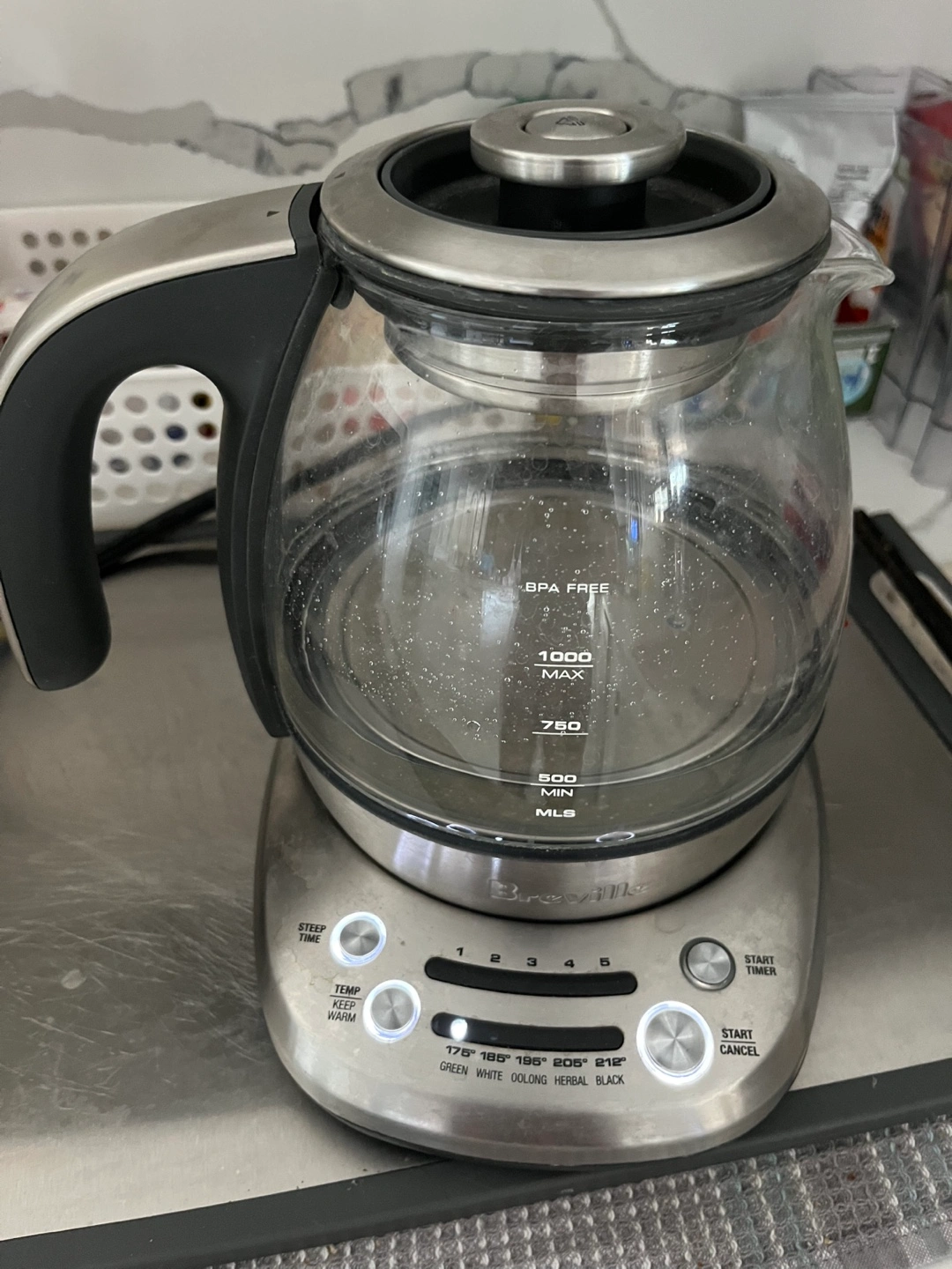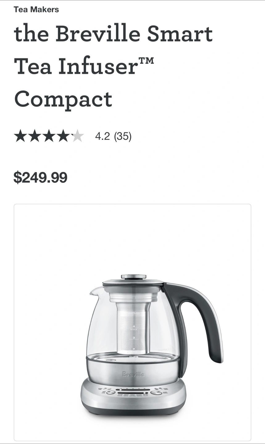 Glass tea maker. Silver base. Features buttons for different tea types. The perfect item for a relaxing afternoon tea.