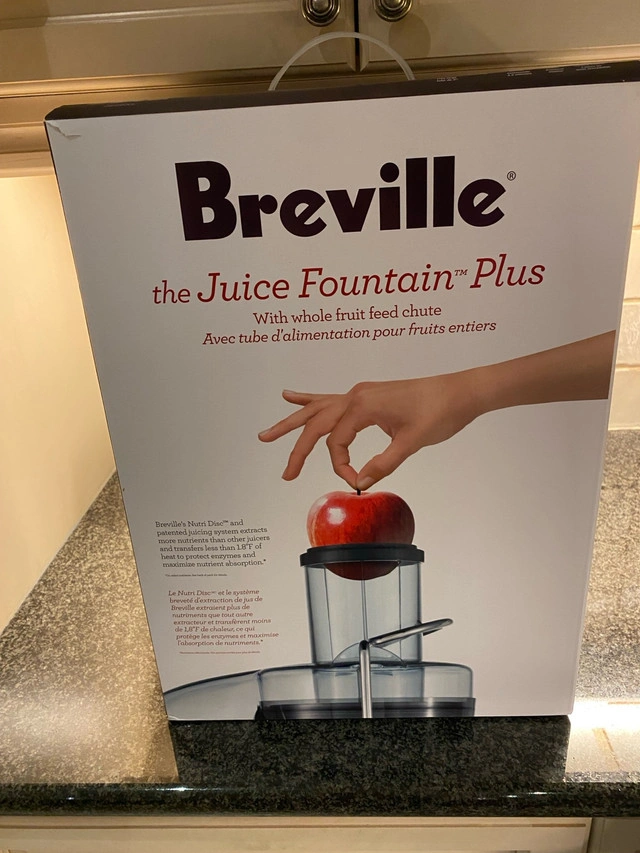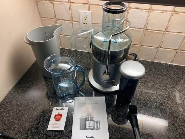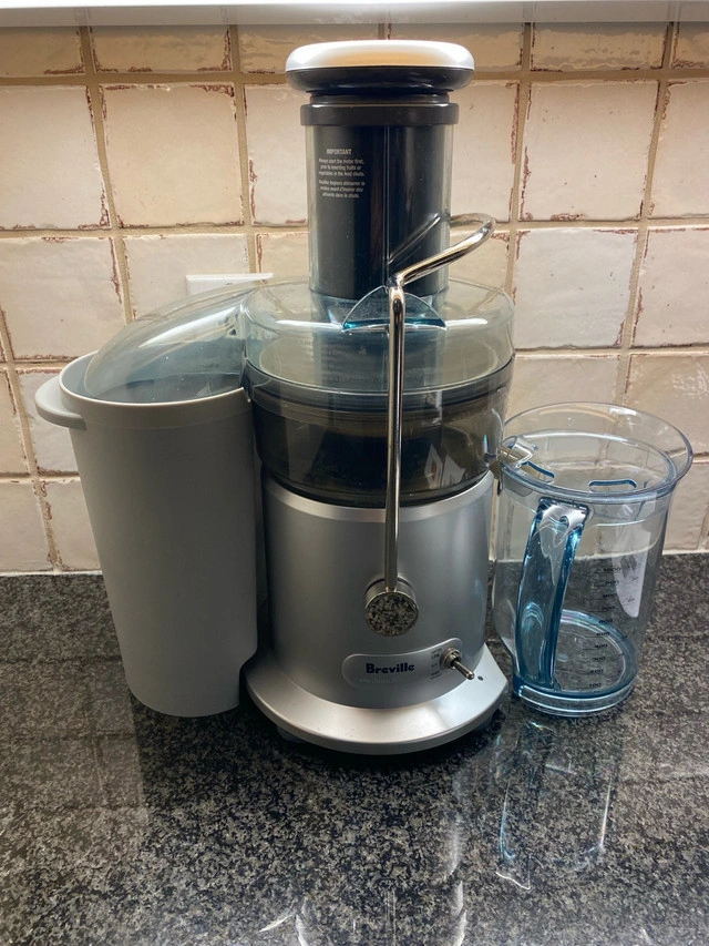 10Extract the most from your fruits and veggies with this Breville Juice Fountain Plus, featuring a powerful motor and stainless steel cutting disc for efficient juicing. This item is in used condition, but well-maintained and ready to help you create delicious and healthy juices. I am including the original box and manual. The juice jug is made of plastic and has a 35 oz capacity. Key Features: * Powerful Motor: Ensures quick and efficient juicing. * Stainless Steel Cutting Disc: For optimal juice extraction. * Large Feed Chute: Accommodates whole fruits and vegetables, reducing prep time. * Easy to Clean: Dishwasher-safe parts make cleanup a breeze. This juicer is perfect for anyone looking to incorporate fresh, homemade juice into their daily routine. I'm pricing mine competitively at $75 considering its excellent condition. If you're reading this, then yes, it's still available!