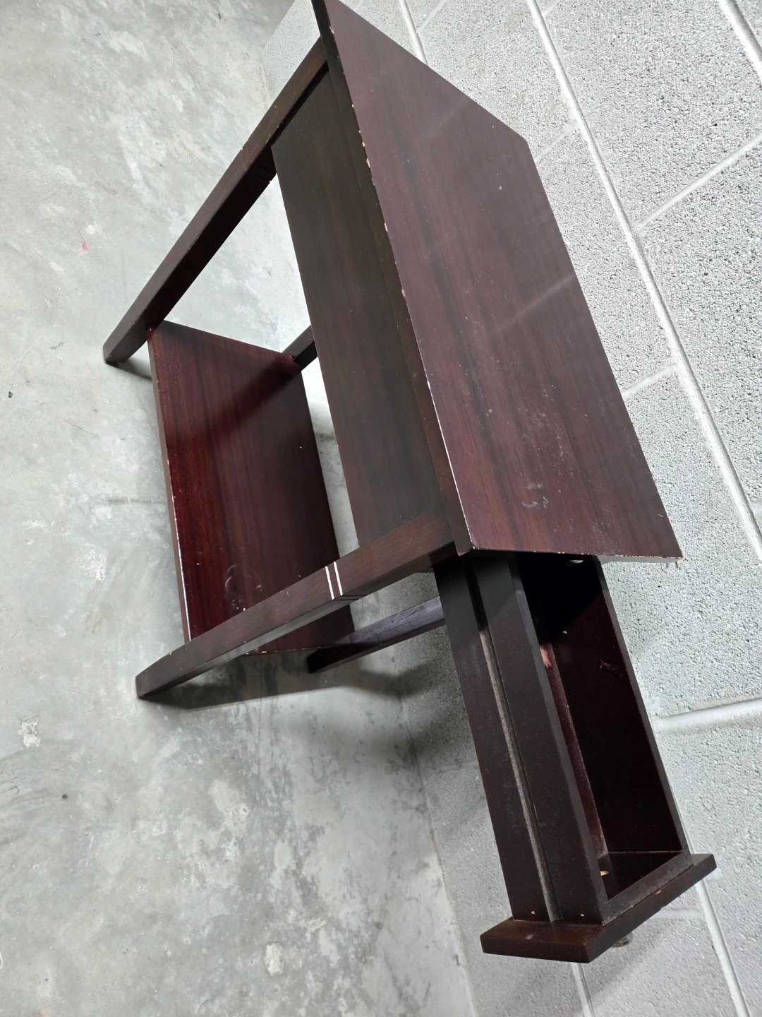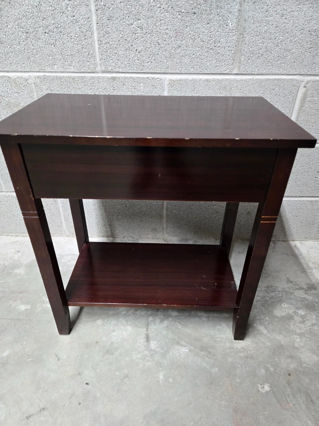 Dark wood end table with one drawer and an open shelf below. It has silver-tone drawer pulls. Some wear on the edges and top surface. 13"w x 22"deep x 23"tall
