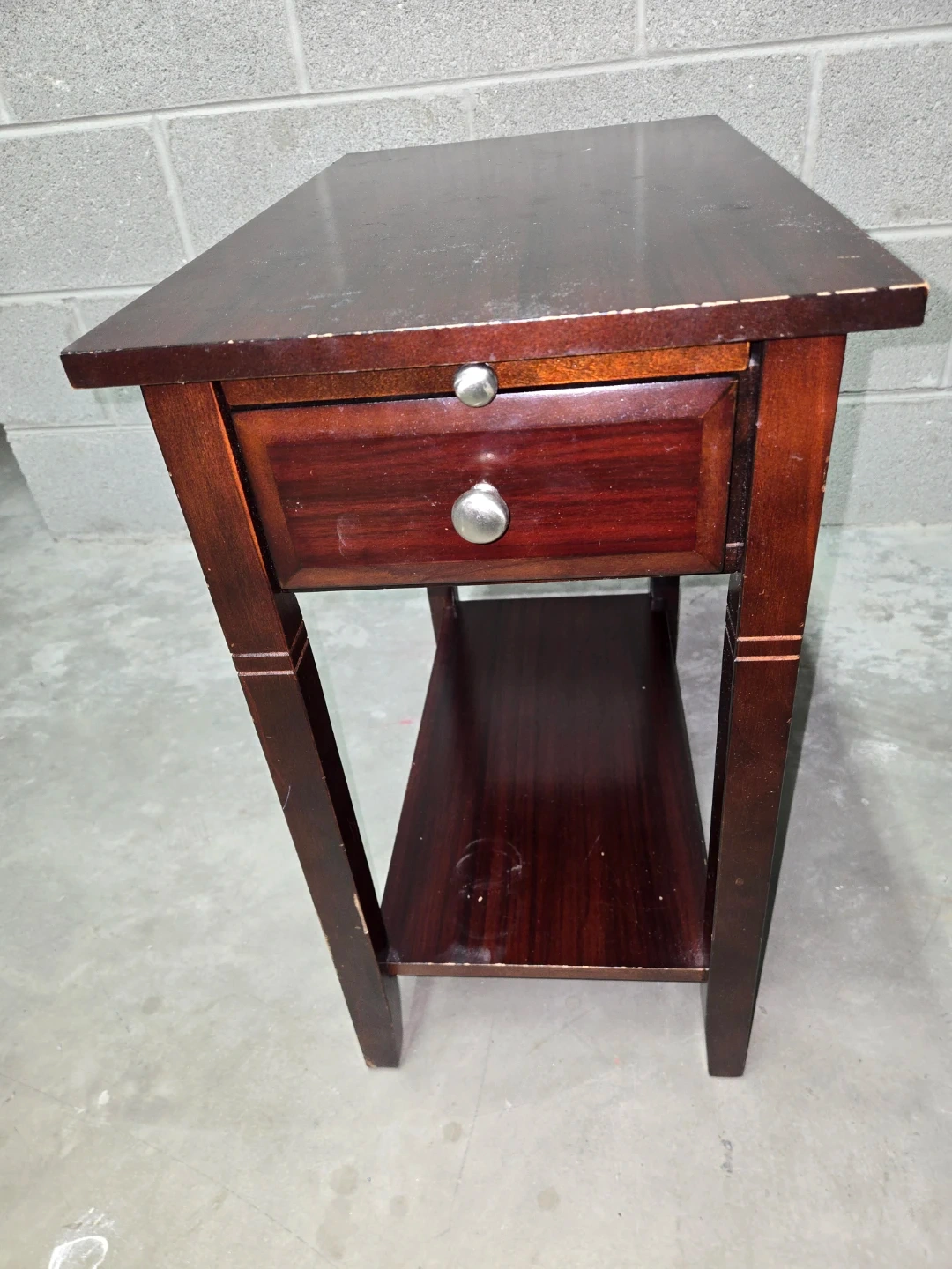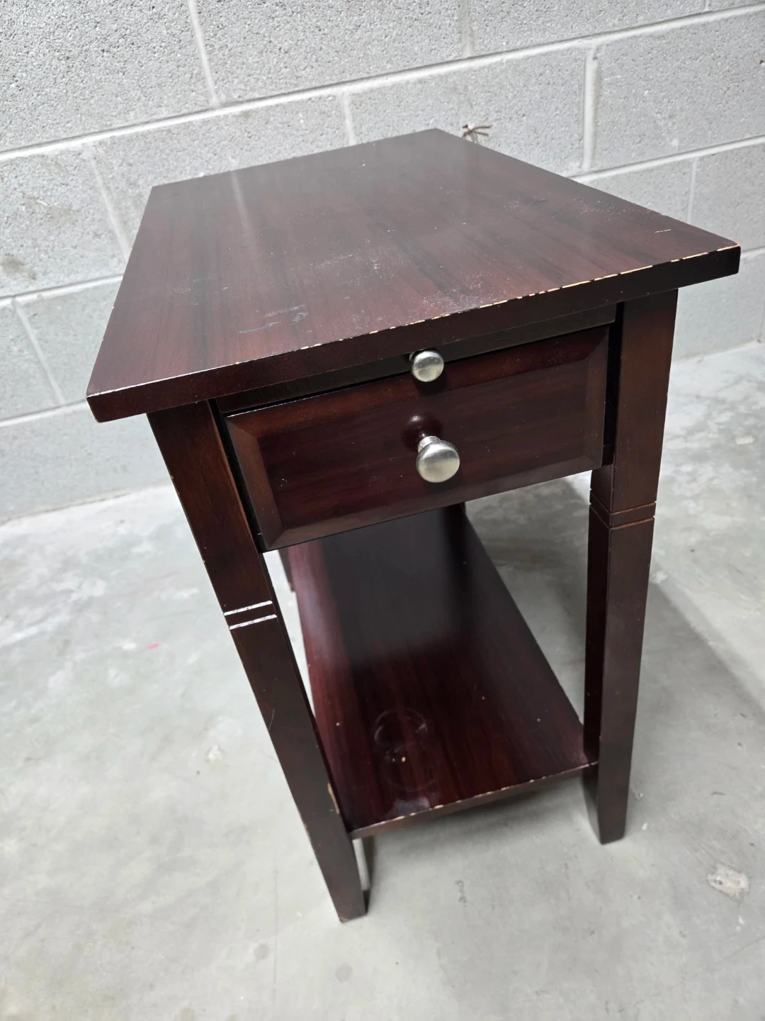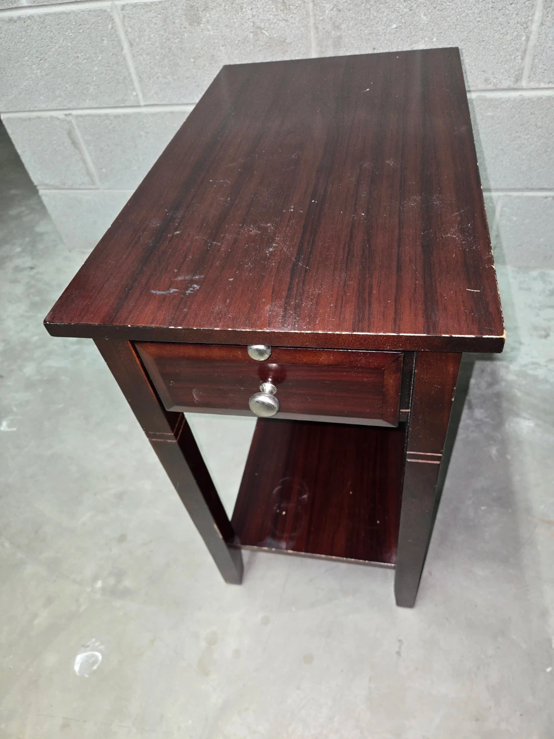 Dark wood end table with one drawer and an open shelf below. It has silver-tone drawer pulls. Some wear on the edges and top surface. 13"w x 22"deep x 23"tall