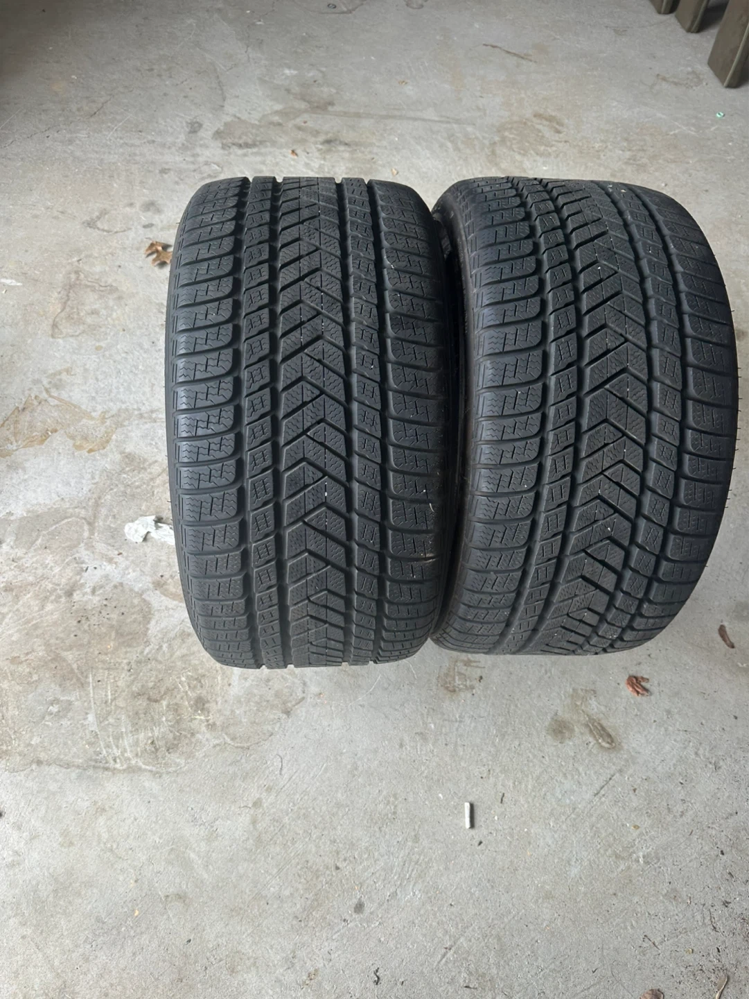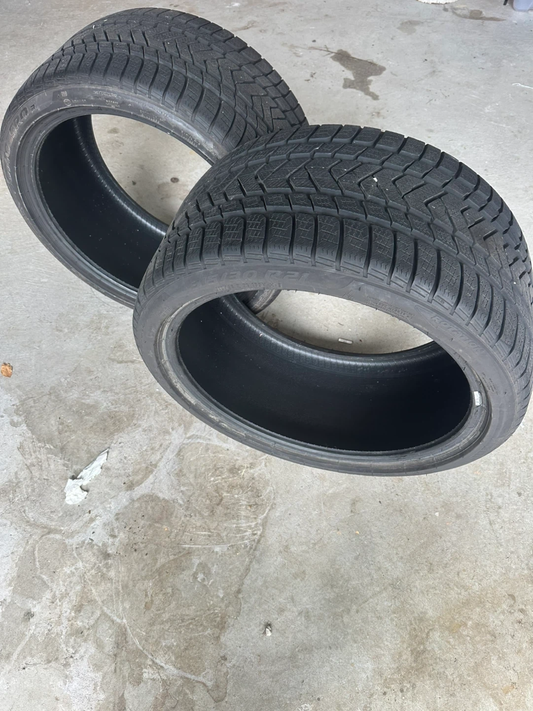 This is a set of two tires. They appear to be winter tires, given their aggressive tread pattern. The tires are black in colour. They're ready for the winter season!