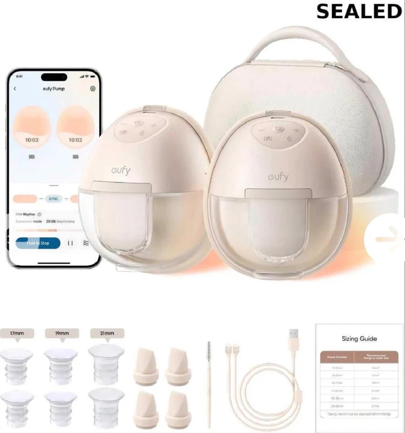 This is a new, sealed eufy Wearable Breast Pump S1 Pro. It comes with various flange sizes to ensure a proper fit. Includes charging cable and cleaning brush. The case charges as well and charges the pumps.