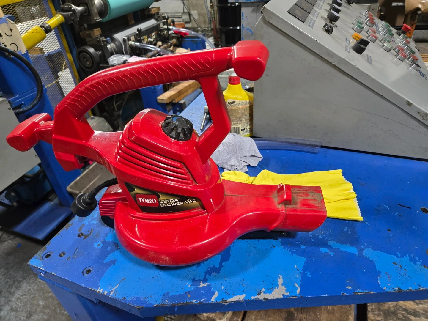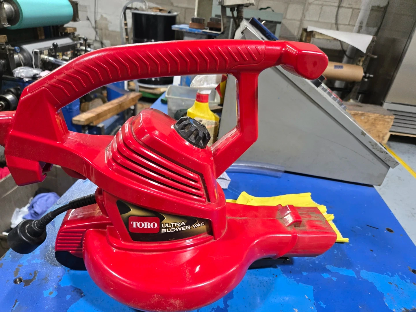 This is a red Toro Ultra Blower Vac. It's a corded electric model. This tool is useful for clearing leaves and debris from your yard.