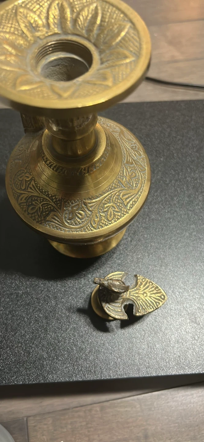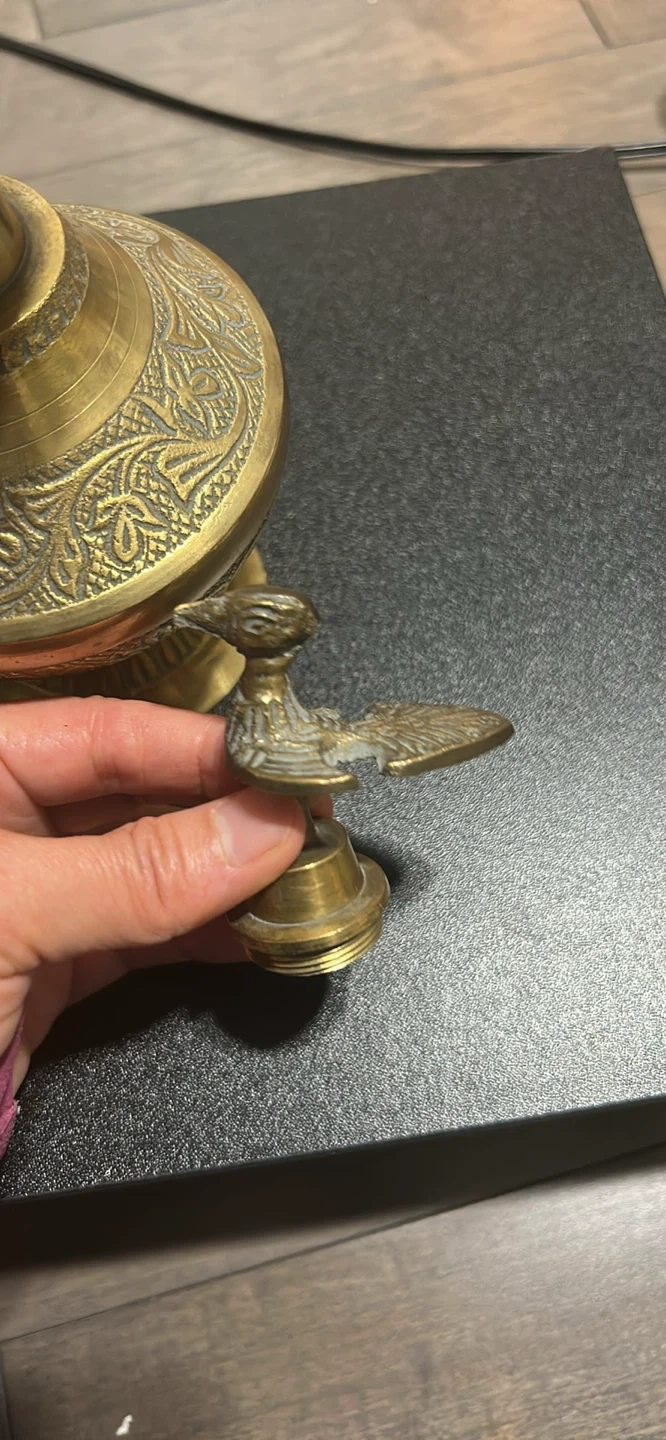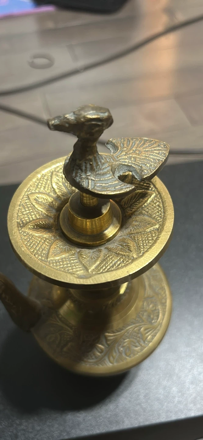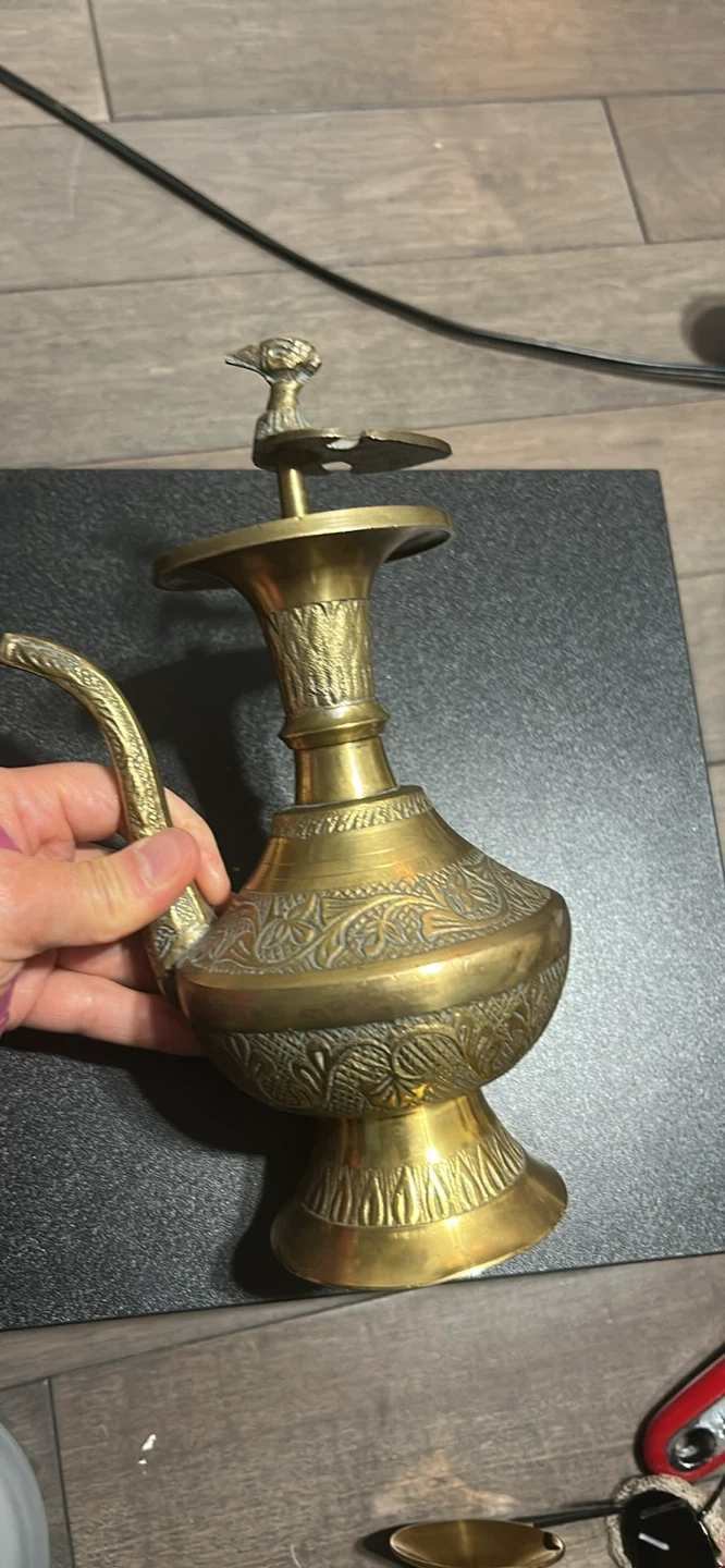 Ornate brass pot lid shaped like a bird with detailed etchings. It appears to be a decorative piece. The top bird figurine detaches.