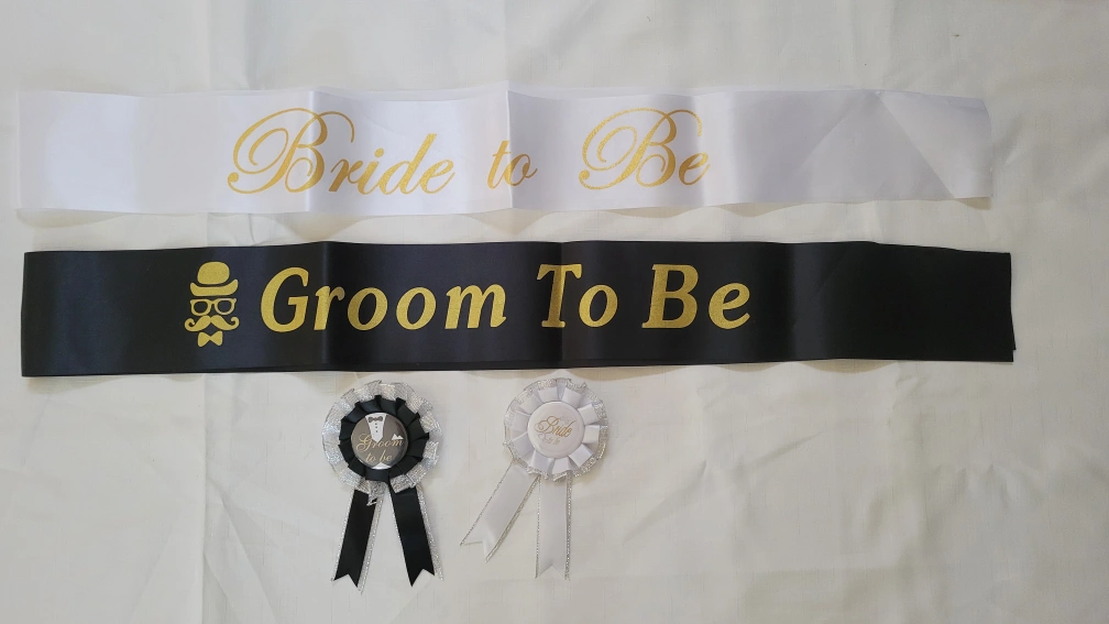 70These are perfect for a wedding or bridal shower decoration, the 'Bride to Be' white sash with gold lettering, a 'Groom To Be' black sash with gold lettering, and matching pins! Perfect for adding a special touch to the celebration. listing price is for all 4 pieces
