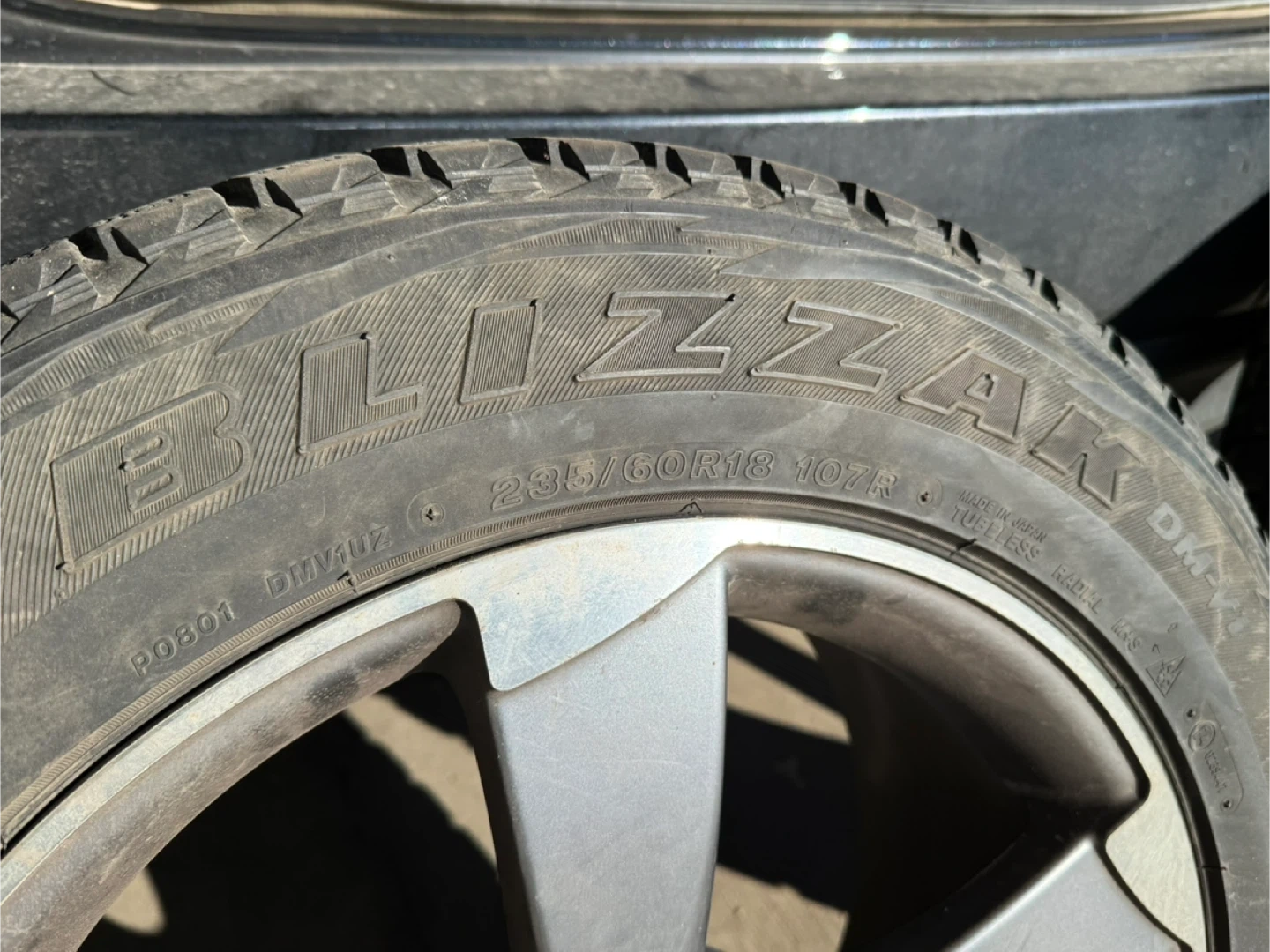 26Selling a set of Bridgestone Blizzak winter tires Size 235/60R18 107R mounted on Audi Alloy rims. Genuine Audi rims in great shape. Tires have couple winter seasons left in them.