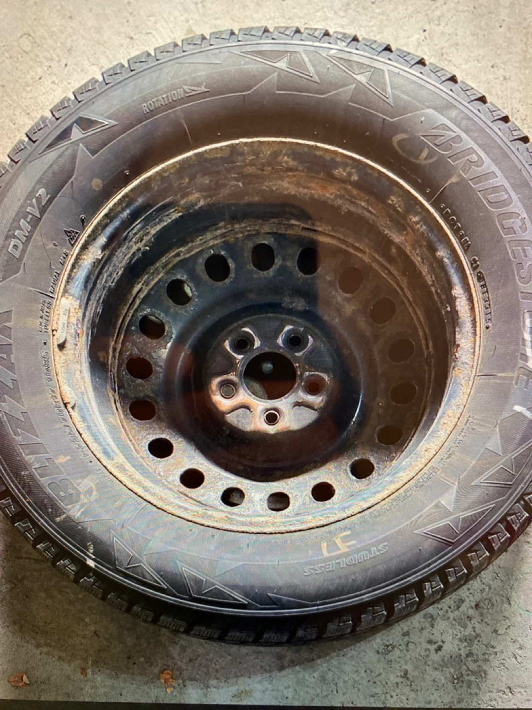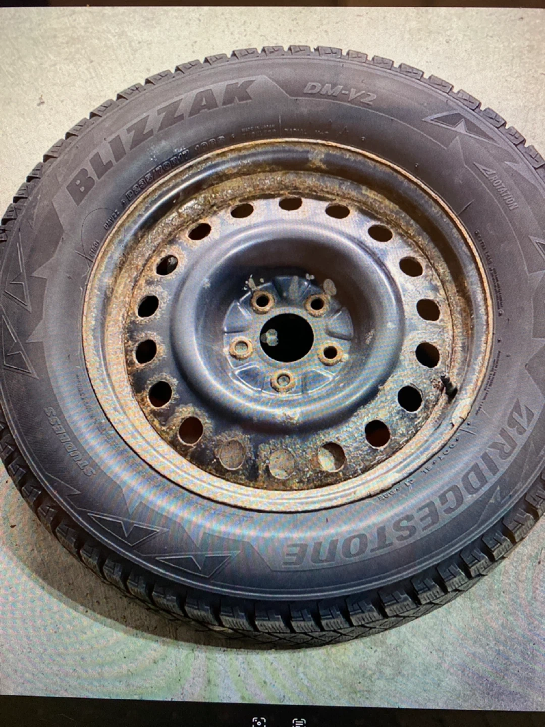 33Set of four Bridgestone Blizzak DM-V2 winter tires (P235/70R17) Tread depth remaining is approximately 3/16" (~4.8 mm) so the tires have some very good life remaining. The tires came from an Infiniti QX60. According to wheel-size.com these tires should also fit Dodge Ram, Ford F150, Landrover Discovery, VW Toareg. Mounted on steel rims but are quite rusted and they should probably be replaced. The rim specs have a bolt pattern: 5x114.3 (5x4.5)