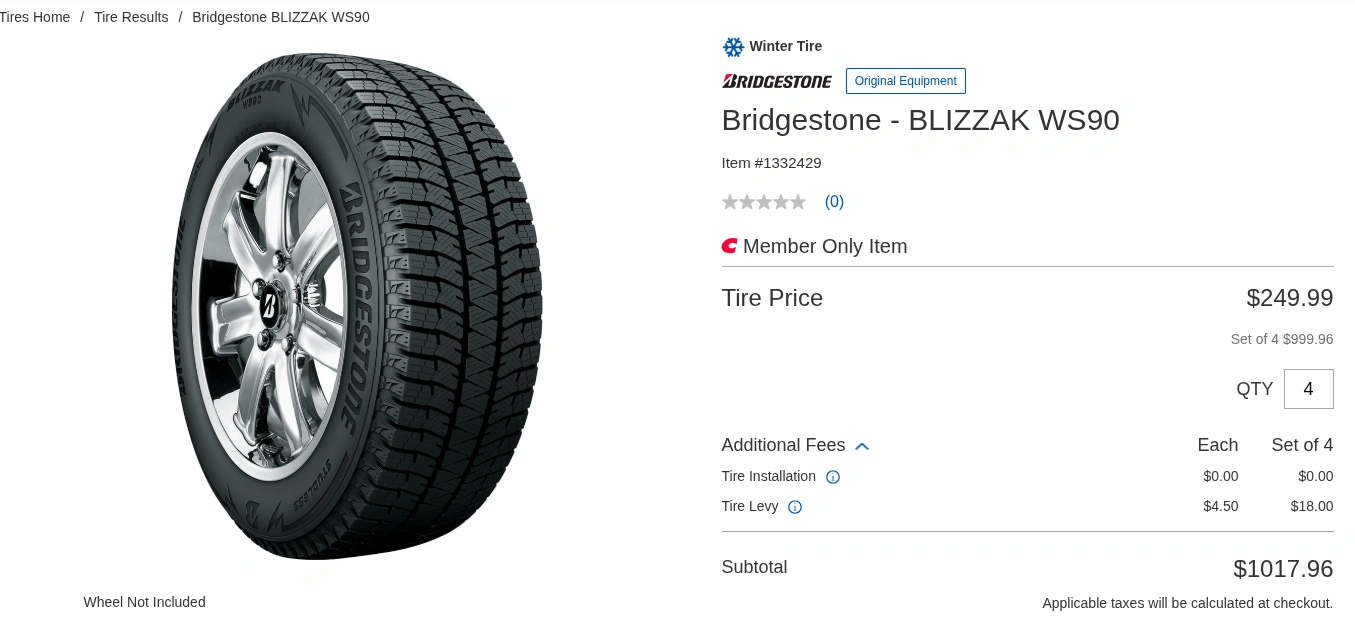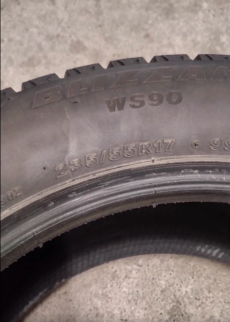 10Count: 4 Winter Tires Brand: Bridgestone BLIZZAK WS90 Size: 235/55R17 99H Tread Depth: 8-9mm (Please check the Picture) Type: Studless, Tubeless Radial Condition: Like new Reason for Selling: Changed the car so don't need these tires anymore. Standard tiers for the following cars and SUVs: Audi A7, Q3 Buick LaCrosse, Lucerne Cadillac CTS: Ford Mustang, Taurus, Escape, Kuga BMW X3 Chevrolet Equinox GMC Terrain Volkswagen Tiguan Volvo XC70 Rated 4.8/5 by users for quiet ride and long wear. Bought from Costco in 2022 Winter and used for only 3000KM within the city. Still have 2 more years of replacement warranty left, that i can help you with if needed. These bad boys retail for $1,080+ including taxes and levies at Costco. DM for more pics, tire video or any questions.