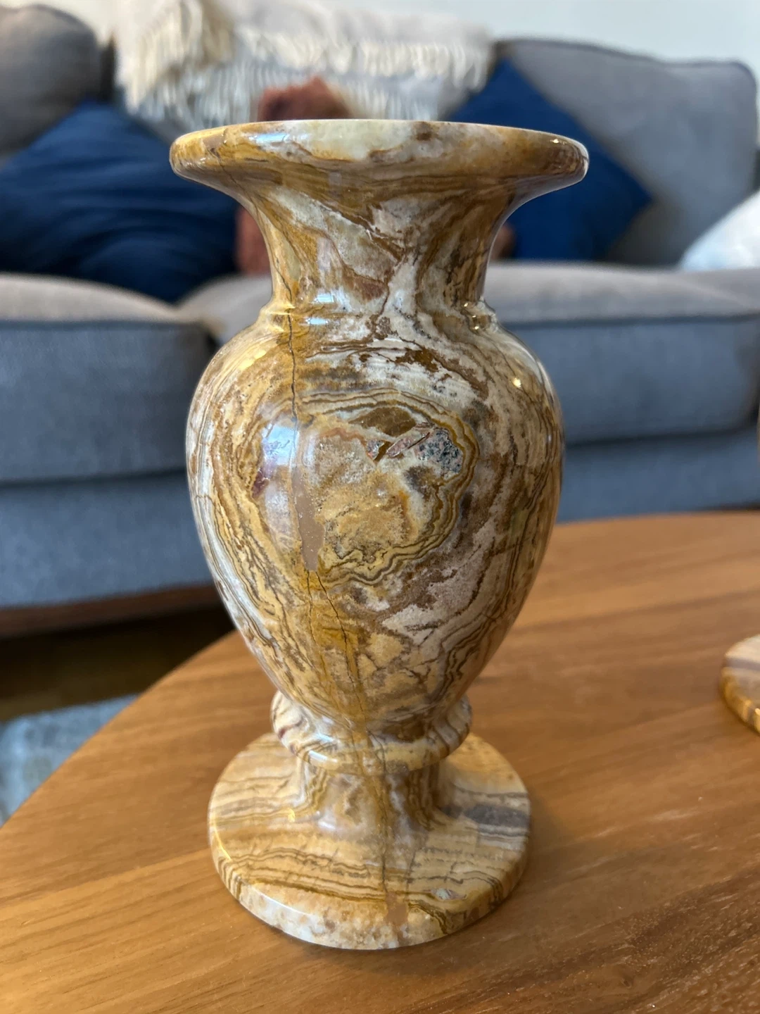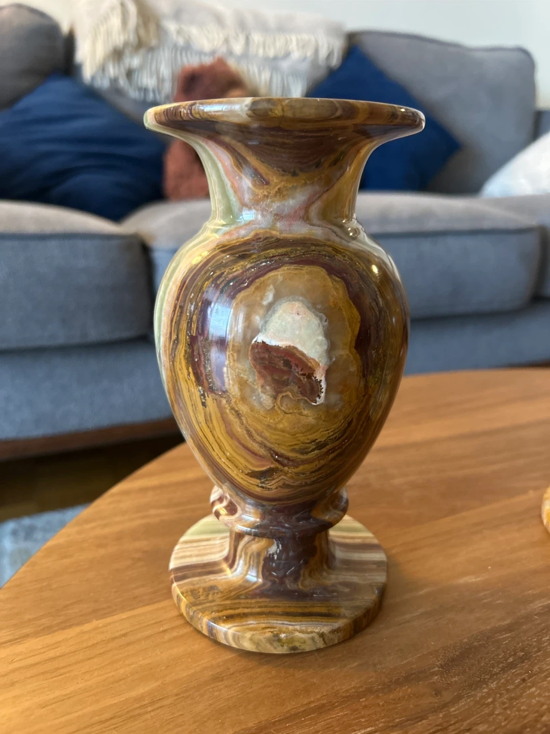 Selling a set of two decorative onyx vases. They have a beautiful, natural stone pattern and would look great in any room. They are in good condition and ready to add a touch of elegance to your home!