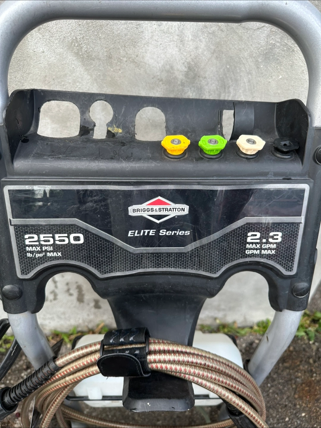 Selling a Briggs & Stratton Elite Series 2550 pressure washer! It features a 6.75 engine series with 190cc. It delivers 2550 max PSI and 2.3 GPM max.
