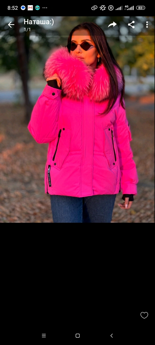 Stylish pink winter jacket. Features a large faux fur collar and zipper closure. Warm and comfortable. Perfect for cold weather.