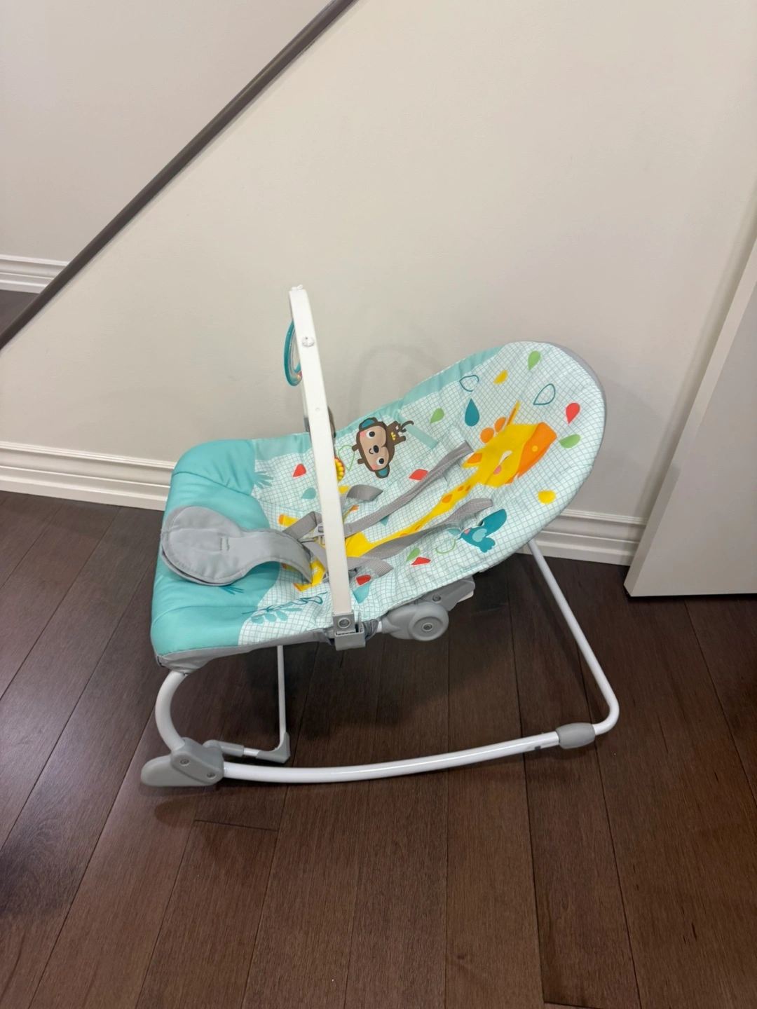 Selling a gently used Bright Starts baby bouncer in excellent condition. It features a cute animal design and a comfortable seat for your little one. Perfect for keeping baby entertained and relaxed!