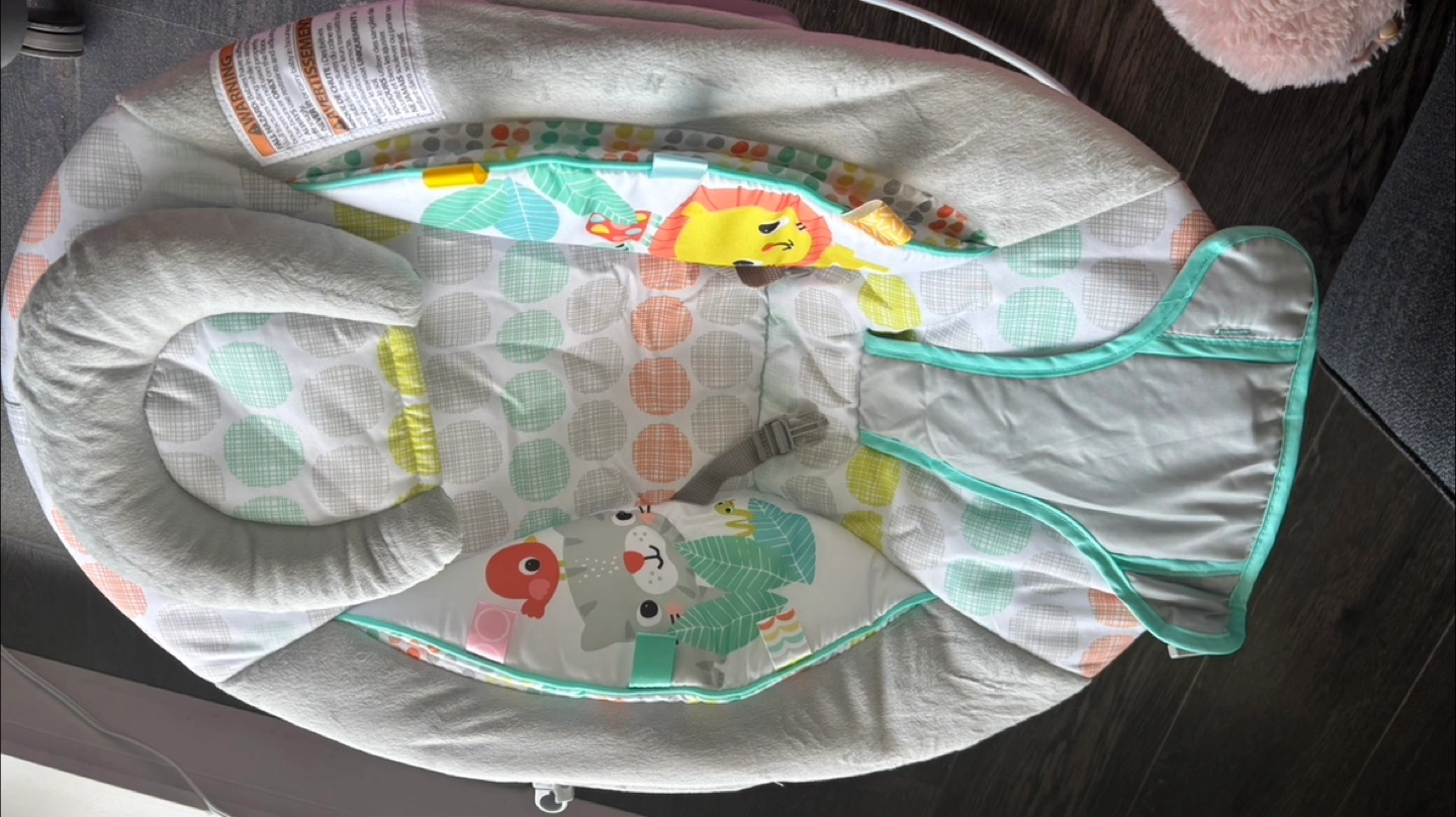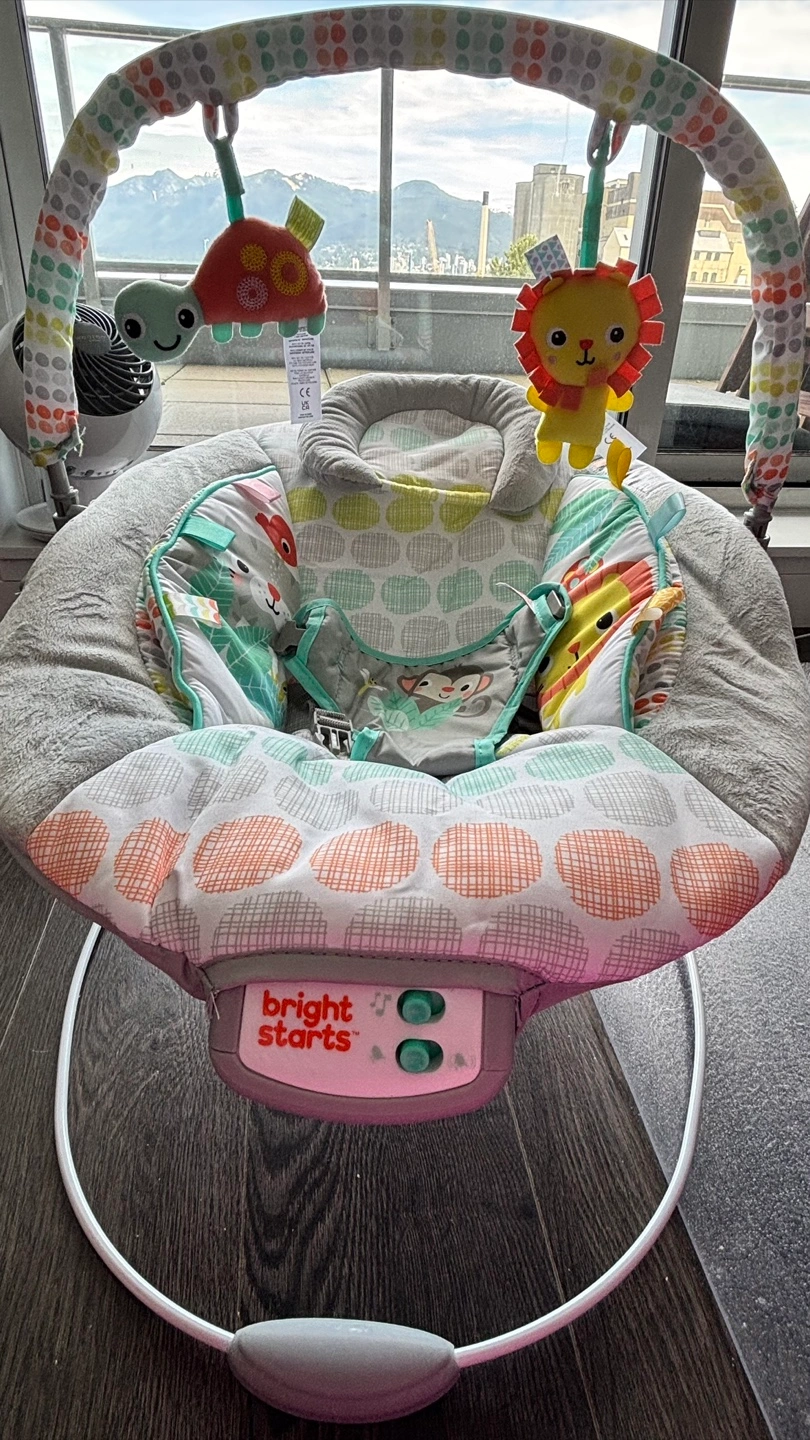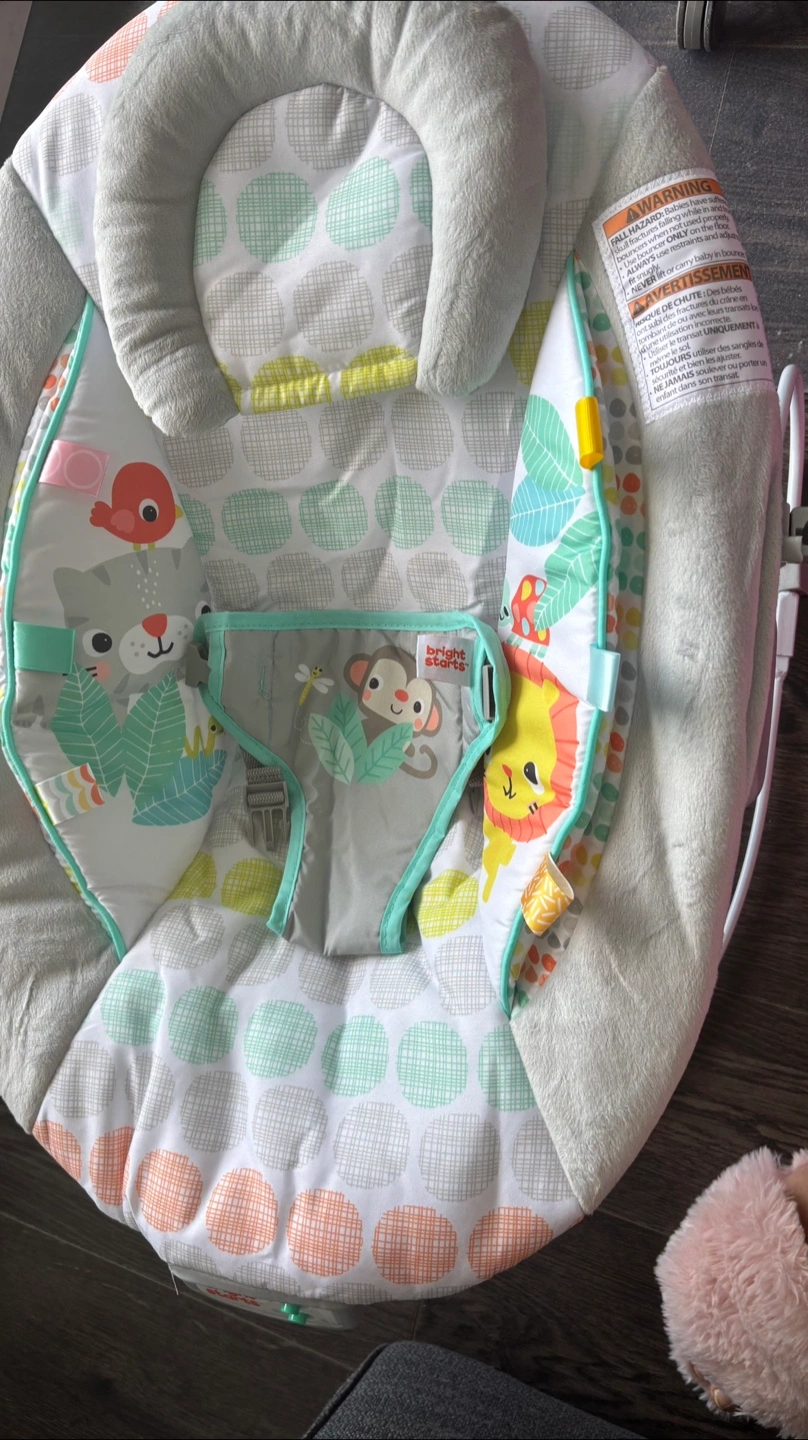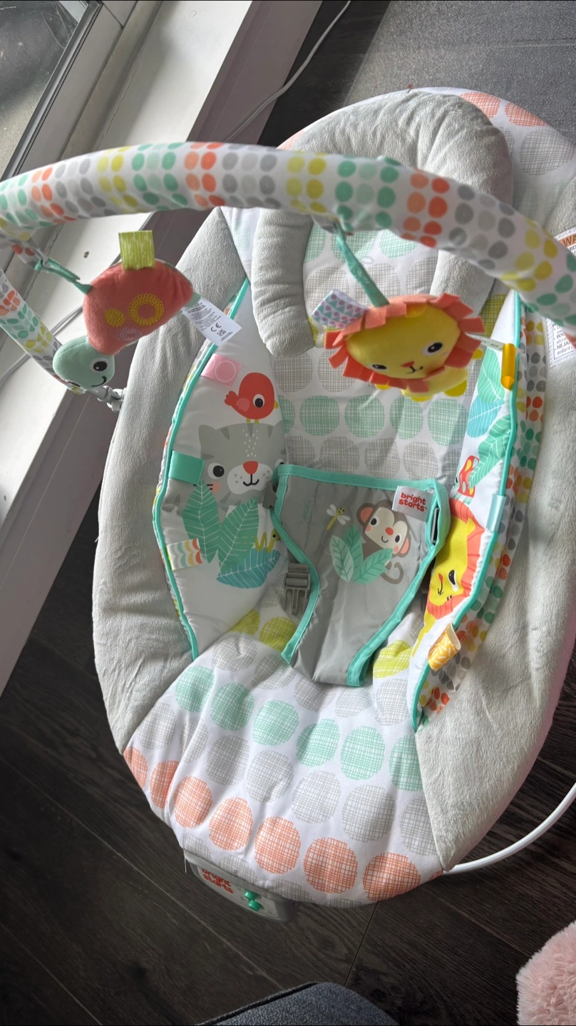 Infant bouncer, jungle animal theme. Features include vibration, music, and hanging toys. Suitable for newborns and infants. Brand new as baby had other similar bouncer