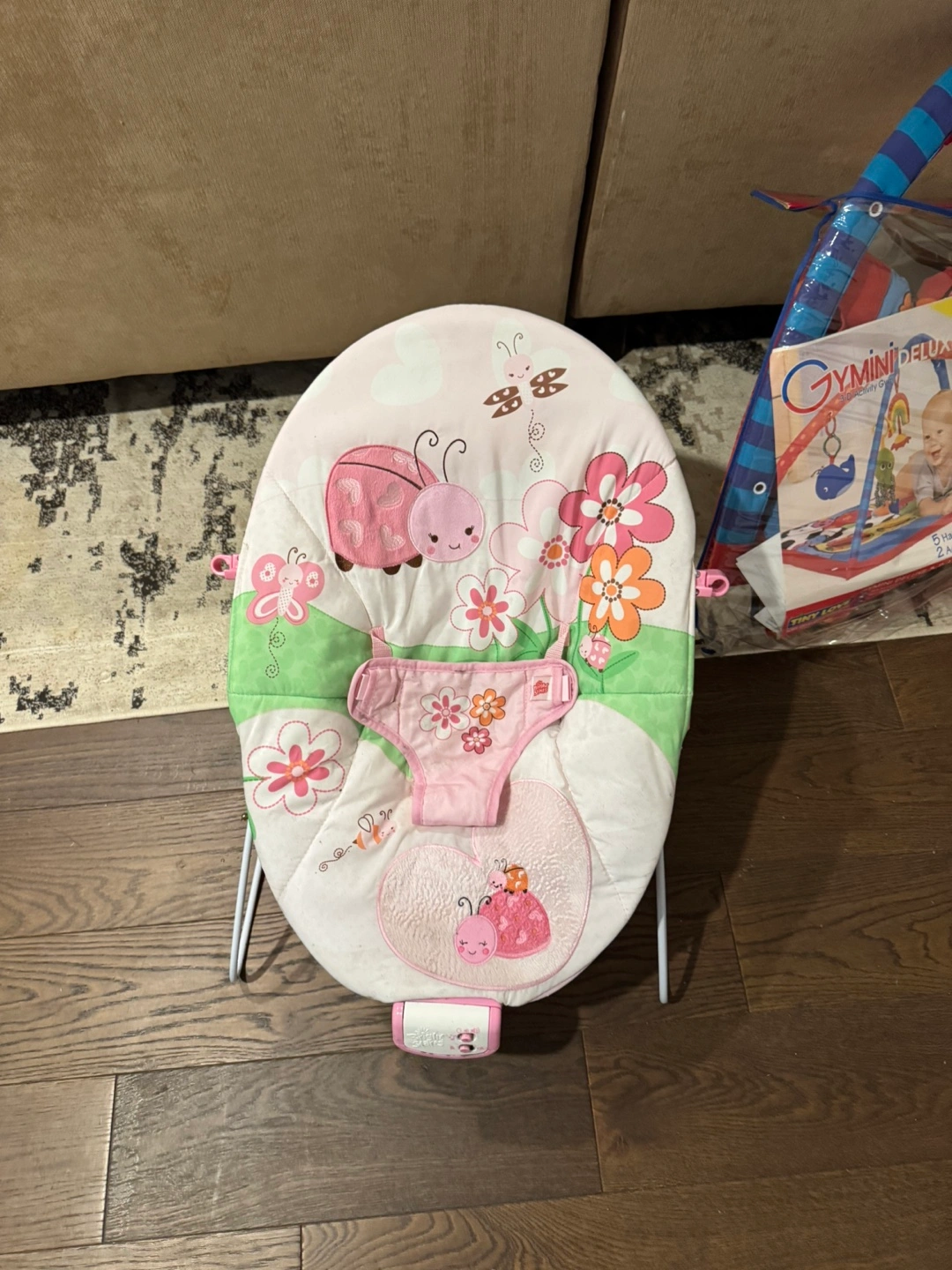93Selling a gently used Fisher-Price baby bouncer seat! It's in good condition and features a cute ladybug and floral design. Perfect for keeping your little one comfy and entertained Vibrates