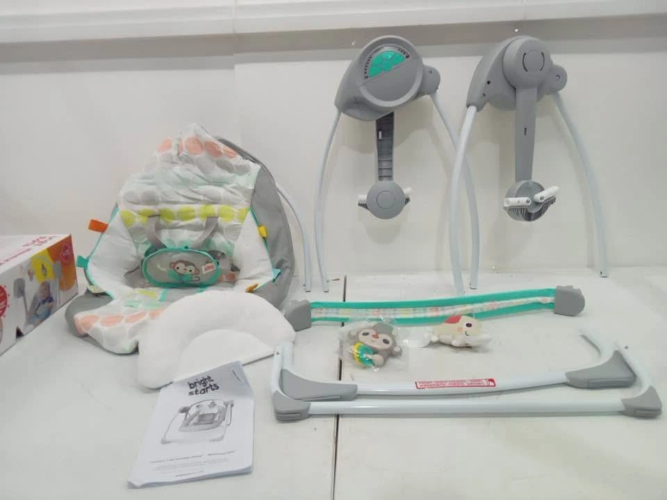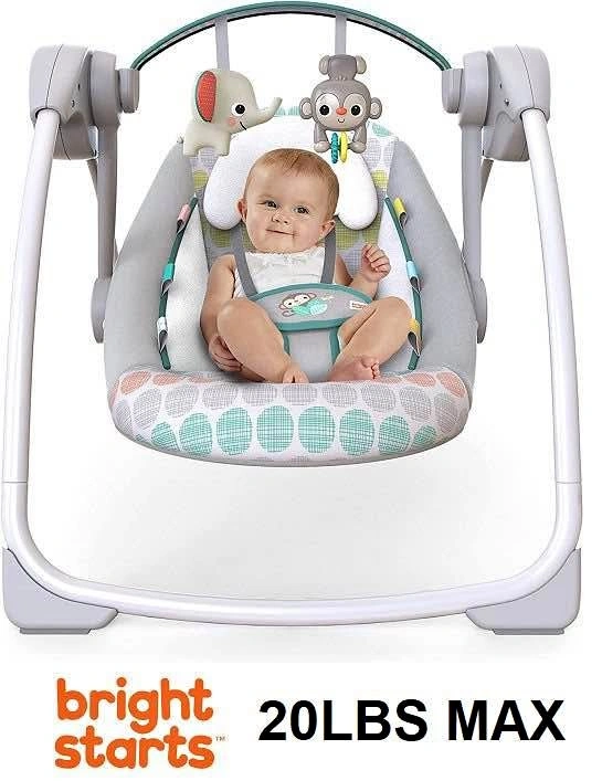 35Bright Starts Whimsical Wild portable compact automatic swing with 10 melodies & adjustable harness - max 20lbs - white safari animals. Item condition: Open - new or appears new Package condition: Retail packaging (distressed) Located near Creditview and Rathburn. 2 available.