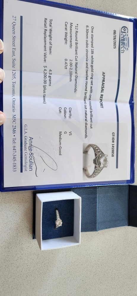 Selling a beautiful round brilliant cut natural diamond ring set in 18k white gold. It features one round brilliant cut 6.30mm cubic zirconia and twelve round brilliant cut natural diamonds. - Carat Weight: 0.47ct - Clarity: VS - Colour: G - Cut: Medium-Good - Total Weight of Item: 4.3 grams - Retail Replacement Value: $4,700.00 (plus taxes) Comes with the appraisal report dated 2025 August 28 and the original box