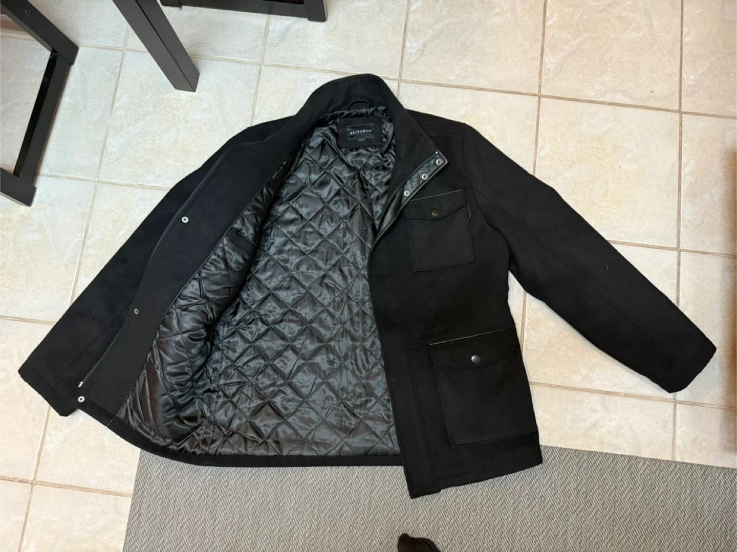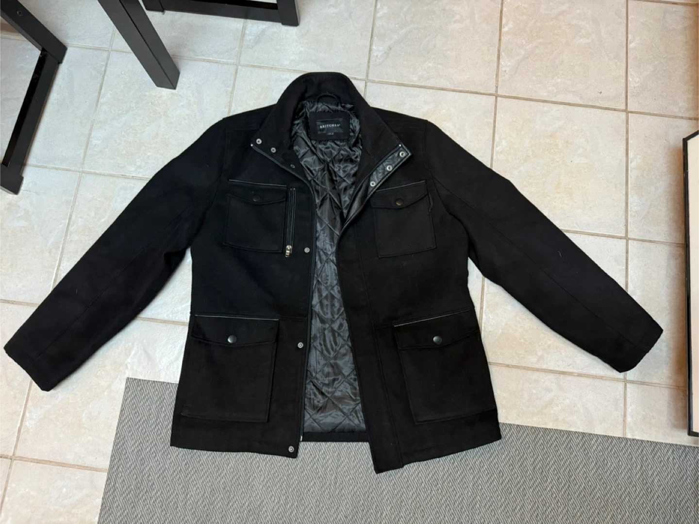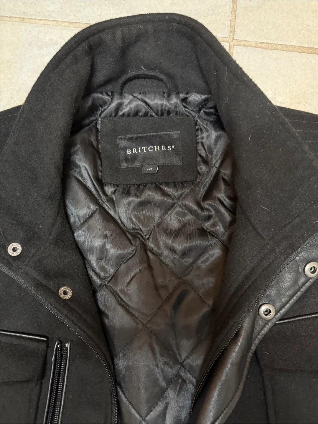 Selling a Britches black jacket in size L. It's in great condition and ready for a new home! The jacket features a stylish design with a quilted lining and multiple pockets. Perfect for adding a touch of sophistication to your wardrobe!