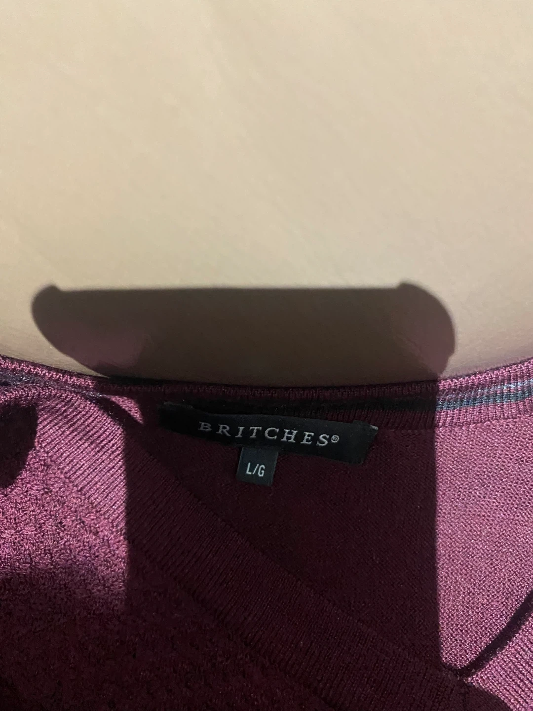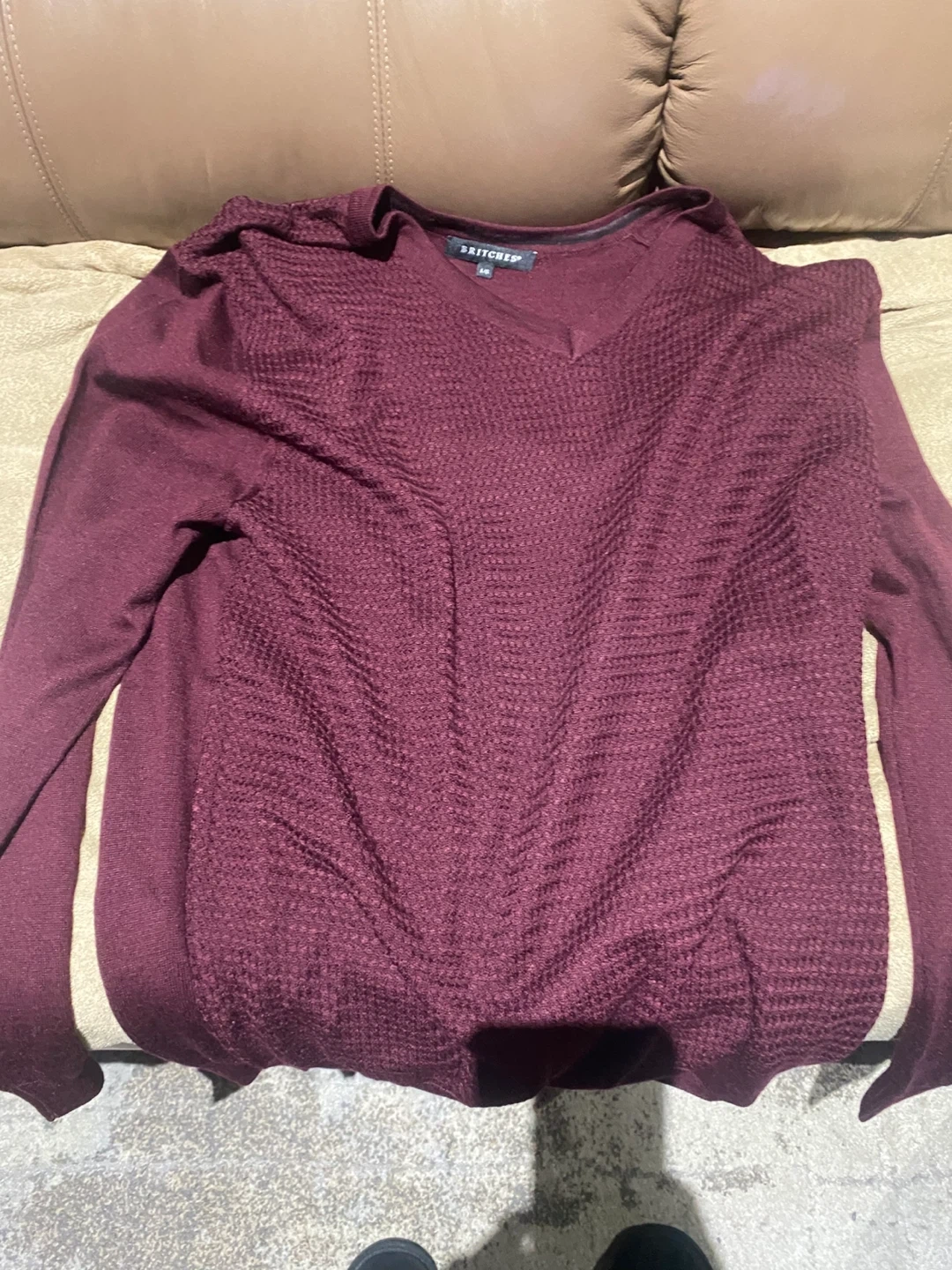 52Cozy Britches sweater in a lovely burgundy colour. It's a size large and in great condition. Perfect for adding a touch of warmth and style to your wardrobe!