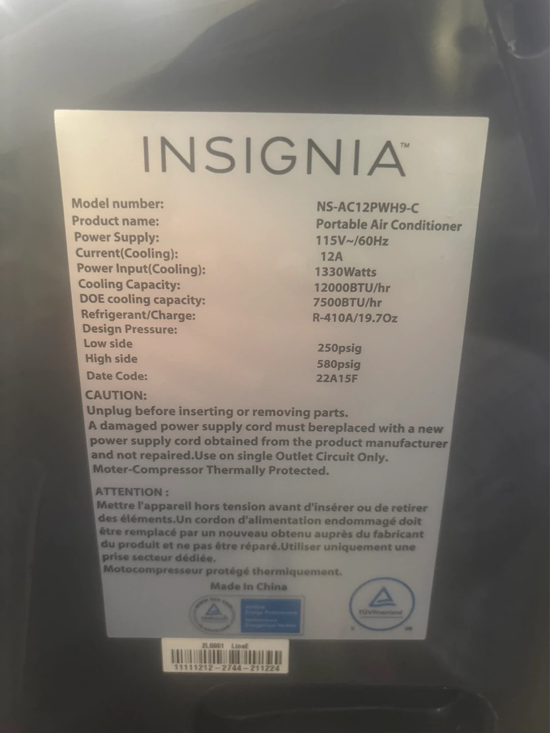 Insignia Portable Air Conditioner NS-AC12PWH9-C