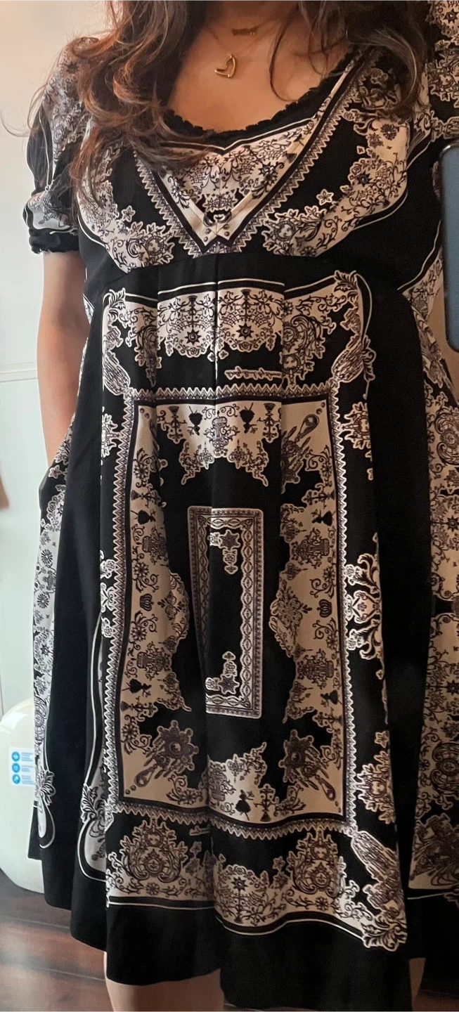 This is a black and white patterned dress from Anna Sui's Dolly Girl line. It features a V-neck and short sleeves. The fabric feels like a polyester blend. Side pockets Bought in Japan for $200+